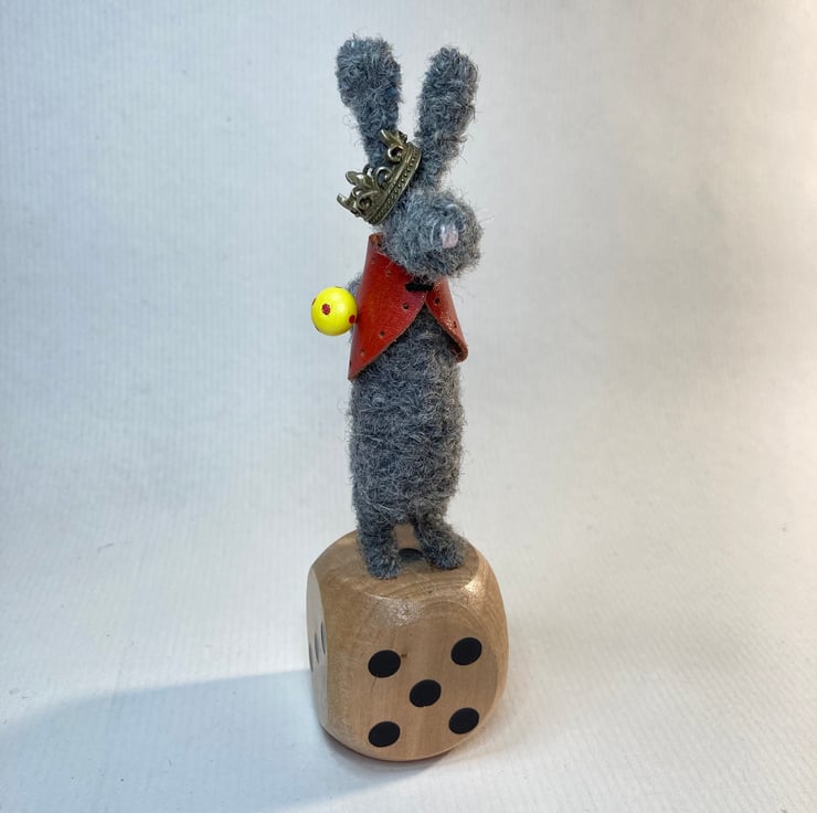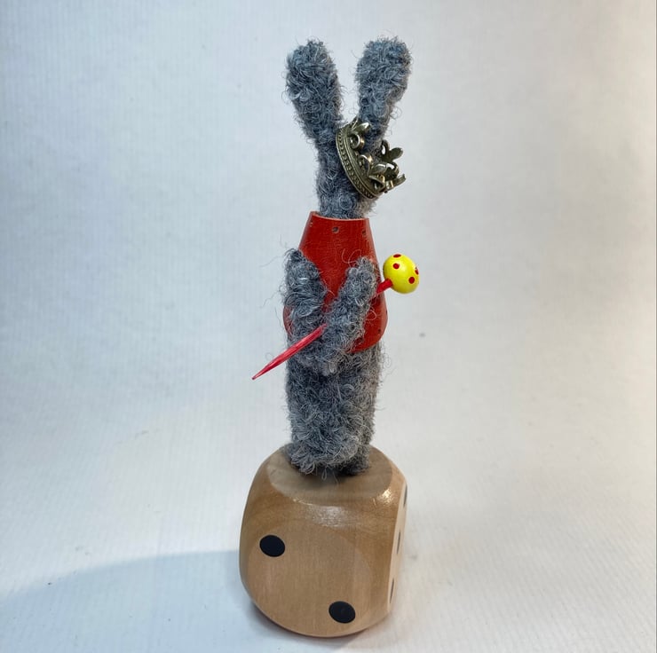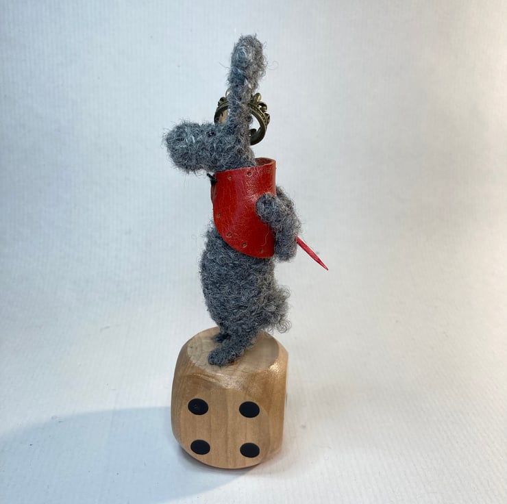 Ralf is made from wire and alpaca Bouclé wool. He has a red leather waistcoat and wooden cane. He stands on a wooden dice and measures 14cm x 4cm.