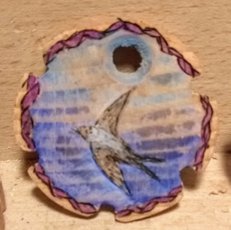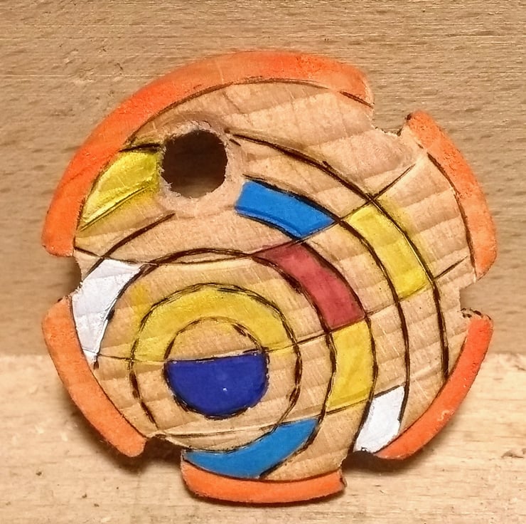 Using a recycled rolling pin, this started out as an ornamental turning exercise, using the lather to add eccentric lines, then it seemed obvious to use the pyrography burner to add a picture and some colour, then it was finished off with child safe acrylic lacquer... approx 41 mm diameter by approx 2mm thick, it is a unique bespoke item that I hope somebody will love to wear as much as I loved making it.