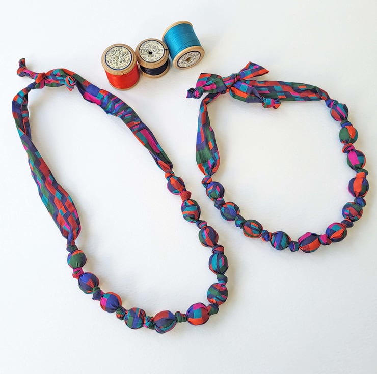 Teal, Green, Orange-red Geometric Liberty Print Fabric Necklace - Ziggy C Print