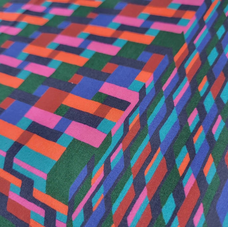 The Ziggy print is a dizzying array of multi-coloured squares and rectangles in orange-red, teal, fuchsia, dark green and navy. It's based on a Liberty artwork from 1971. Great for pattern lovers and those who like geometric prints.