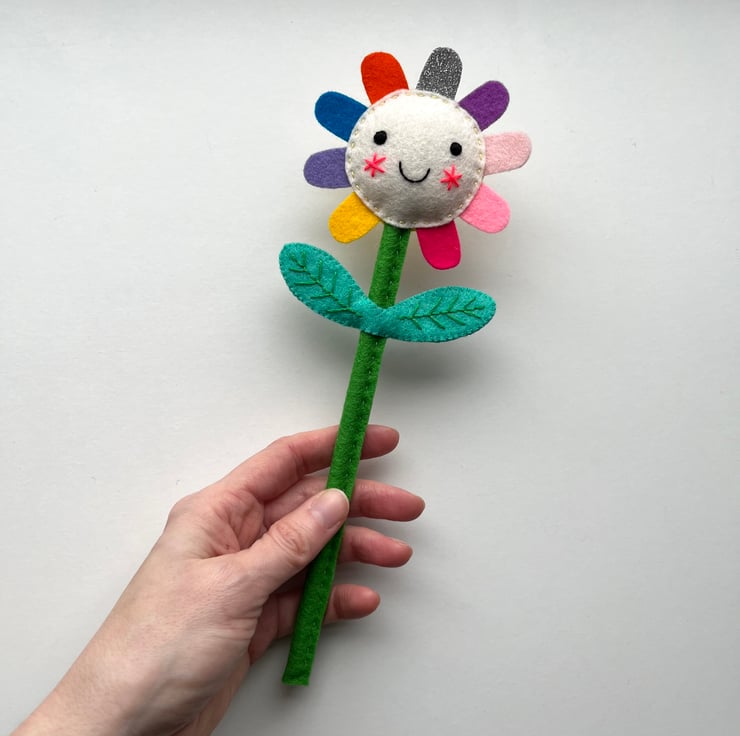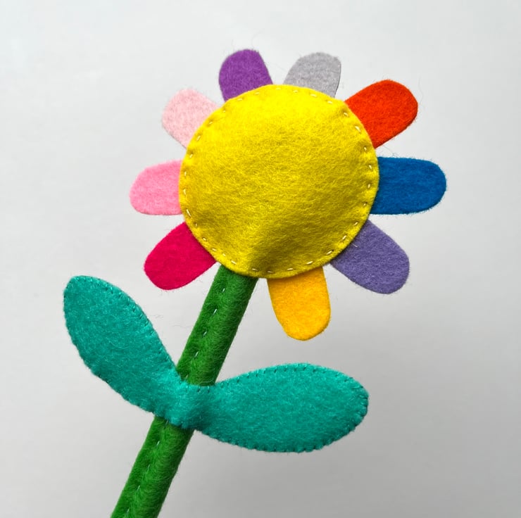 This cheerful hand stitched flower will never need watering, will always make you smile and will be happy wherever you put it in the house! A jolly gift for a friend, your lovely mum or to treat yourself. Just pop the flower in a vase!