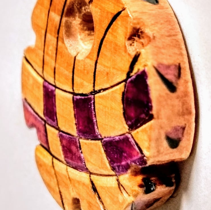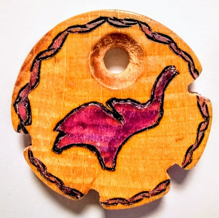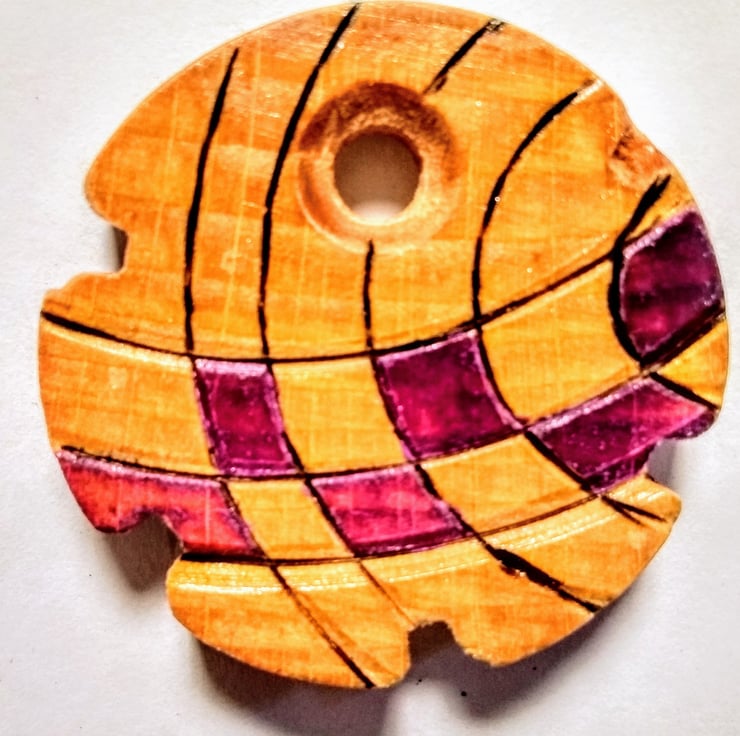 This started as a look at ornamental turning on a wood lathe, making off centre patterns, then it seemed obvious to use pyrography and colour to add decoration, using acrylic paints, then finally child safe acrylic lacquer. approx 40mm diameter x 7 mm thick...so it could be a hanging decoration, a pendant, a totem on a handbag, a keyring totem etc