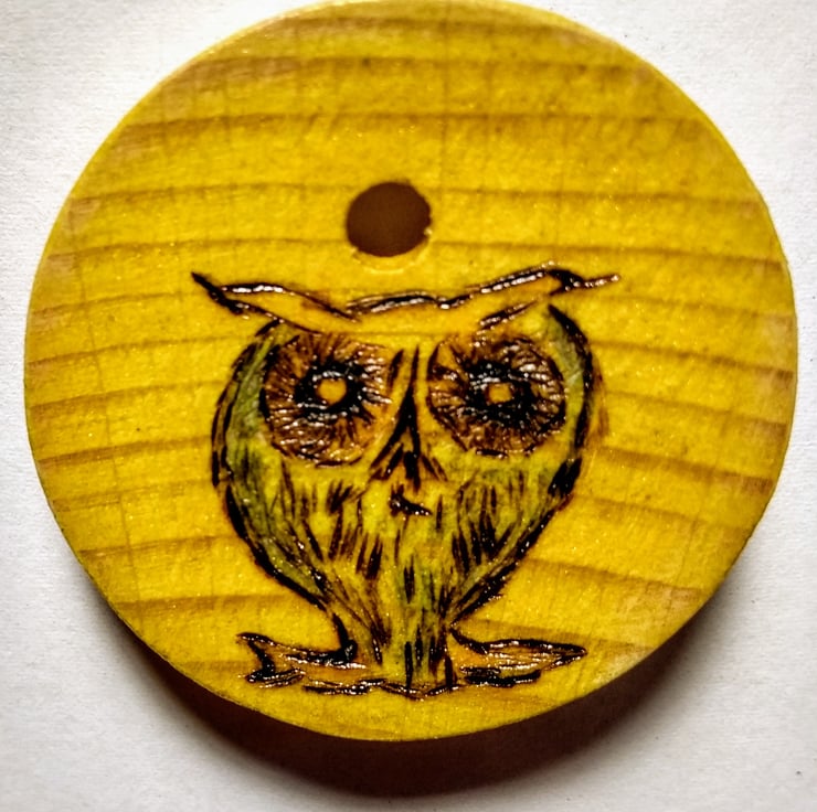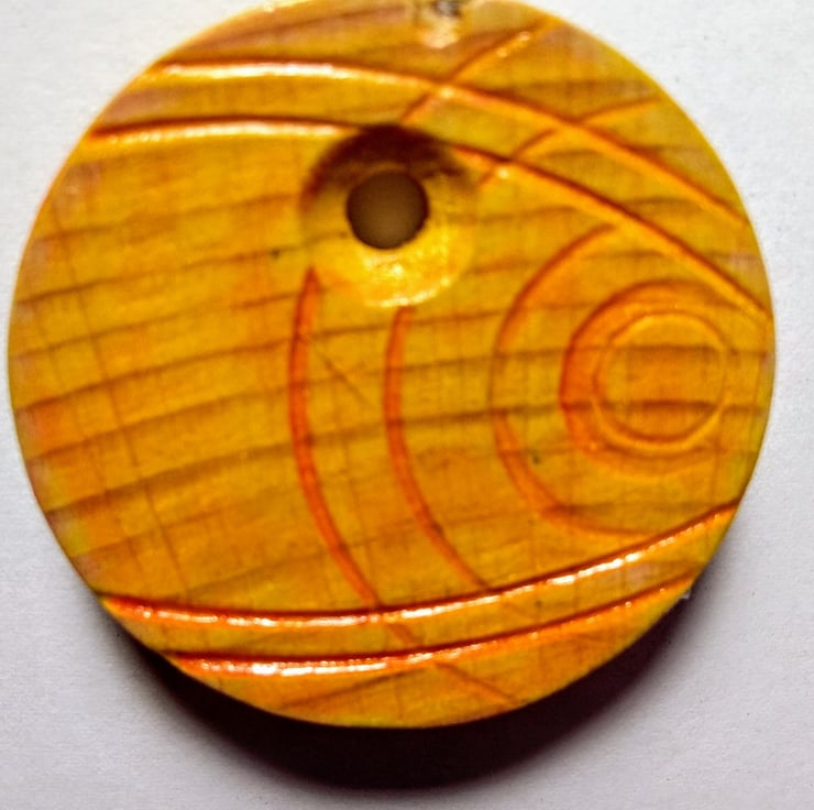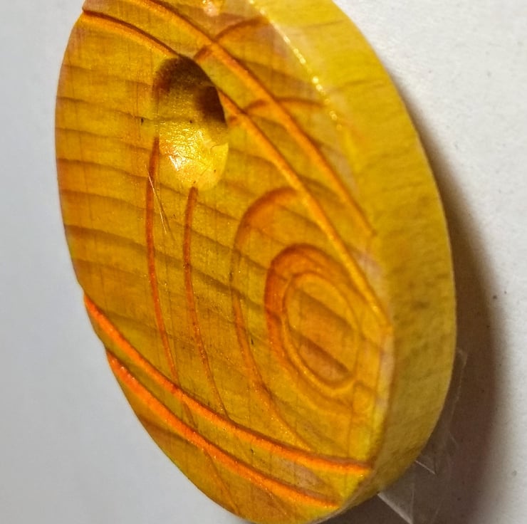 This started as a look at ornamental turning on a wood lathe, making off centre patterns, then it seemed obvious to use pyrography and colour to add decoration, using acrylic paints, then finally child safe acrylic lacquer. approx 40mm x5 mm thick