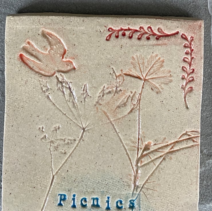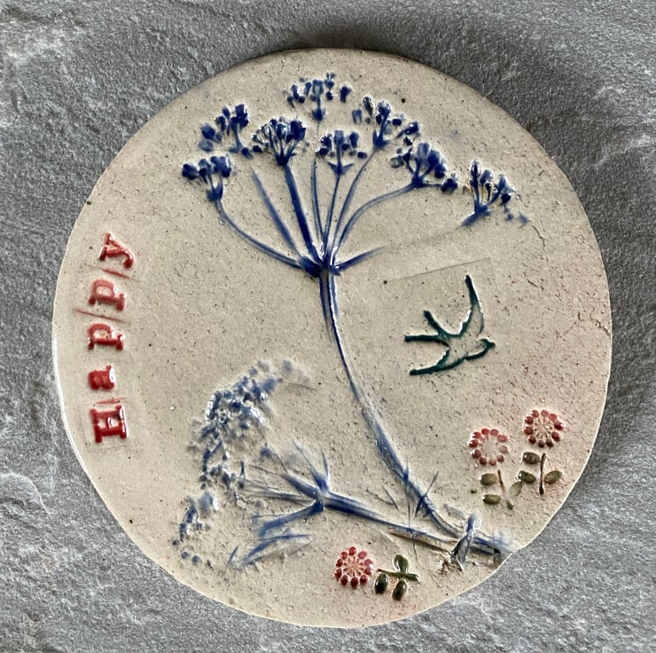 The coasters are then glazed with glazes and underglazes, carefully painting each area with a different coloured glaze, carefully wiping back lettering and foliage detail before adding a top coat of glaze. I then fire the work again to 1240 deg c. making them suitable for indoor and outdoor use.