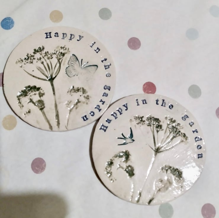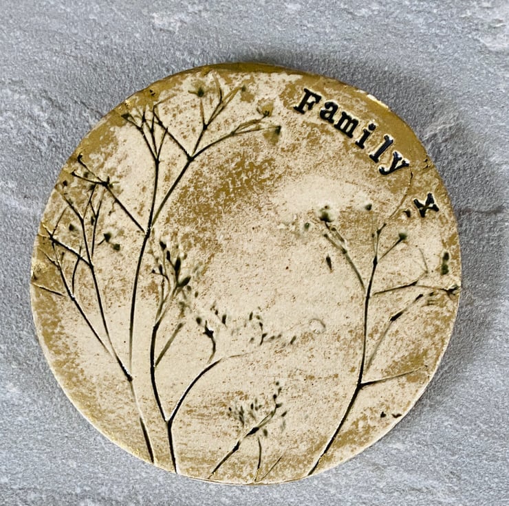 After kneading the clay to remove any air bubbles, each item is made by rolling out the clay and decorated by hand, with foliage from our own garden or foraged from the local Lincolnshire countryside. The foliage is hand pressed in the clay to create an impression. I use vintage stampers to create the lettering detail. They are then bisque fired in the kiln to 1000 degrees c