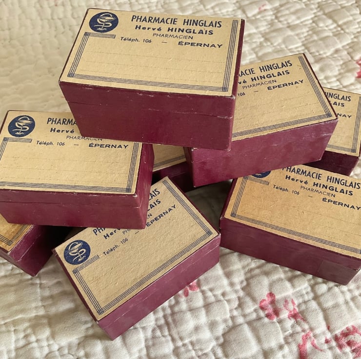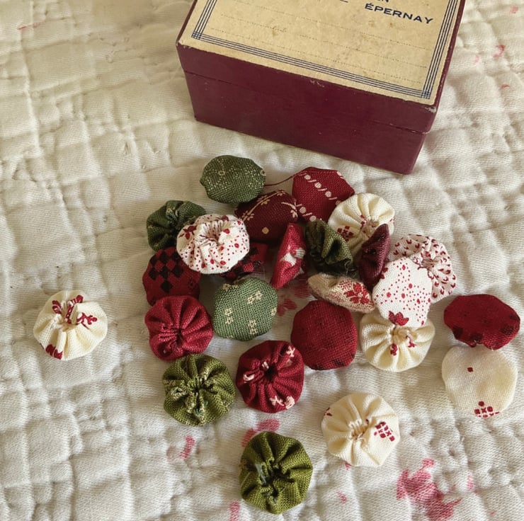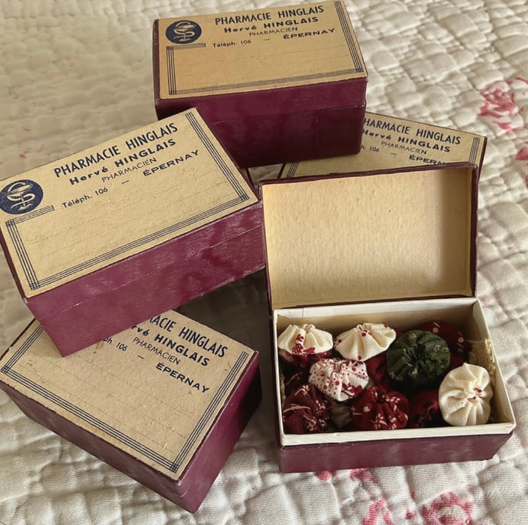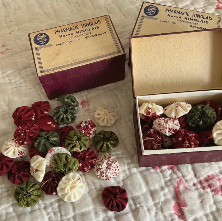 A mini French vintage ‘pharmacie’, rectangular cardboard box, filled with 25 handmade Suffolk puffs (fabric yoyo’s), mainly in Moda fabrics, with Christmas in mind.