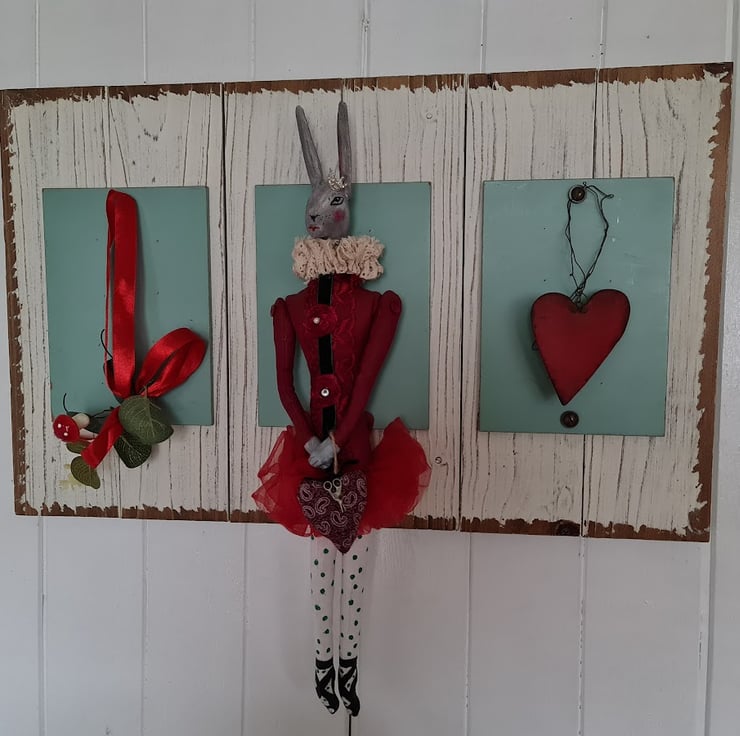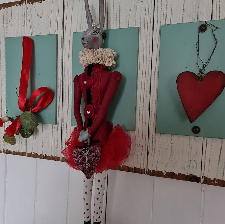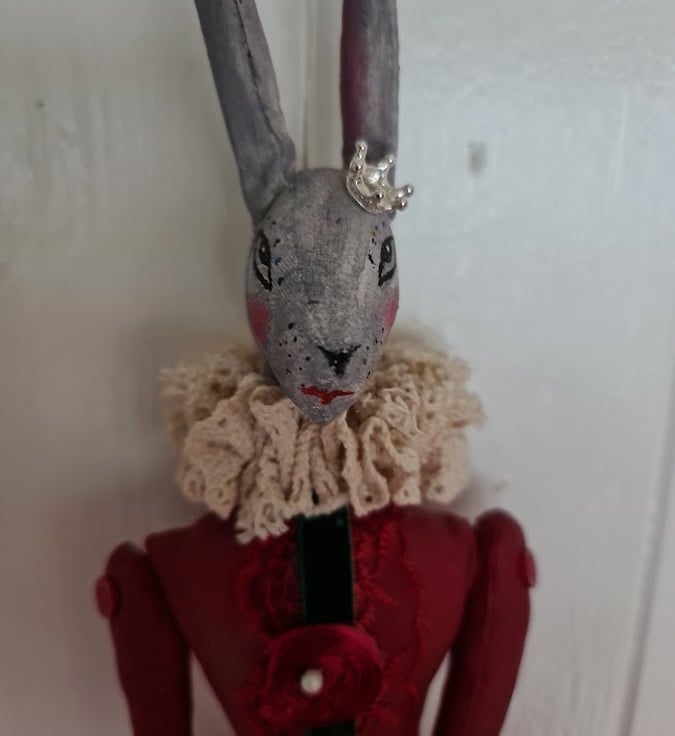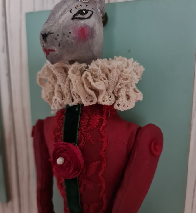 This ballerina hare is hand and machine stitched in unbleached cotton. She is hand painted and trimmed with royal red and deep green lace and velvet. An Elizabethian style ruffle decorates her neck and rhinestones sit on the front of her points.