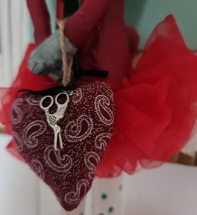 She carries a heart and sliver scissors, and upon her head sits a little silver crown ever so slighly slipping to one side, on her back is sewn a loop of jute twine for ease of hanging.