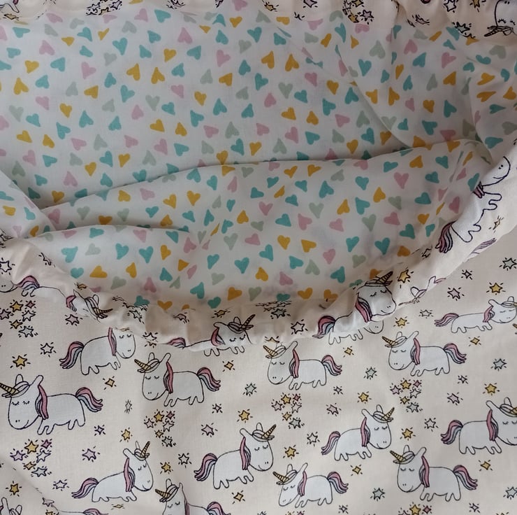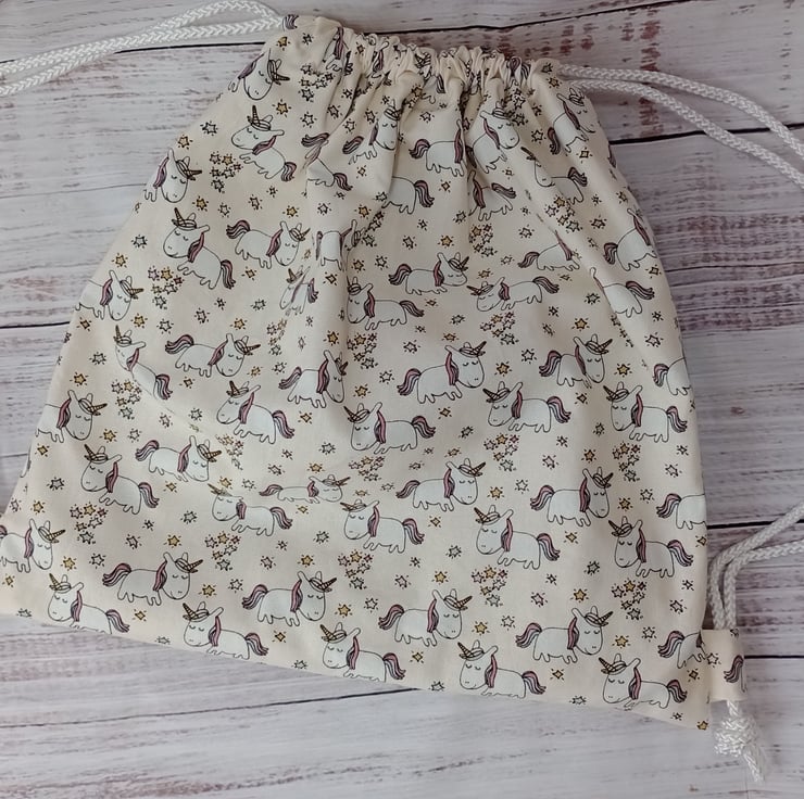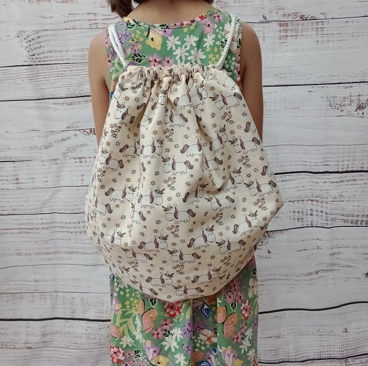 Cotton drawstring backpack with adjustable straps. Perfect for carrying toys or other items. Fully lined and washable.