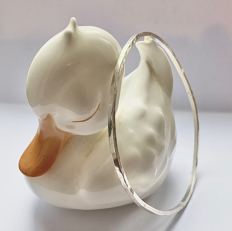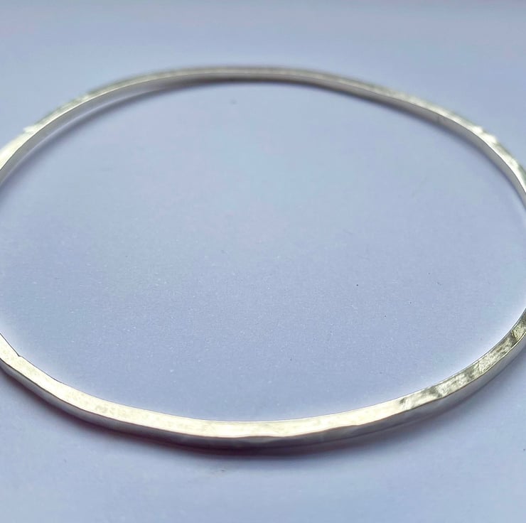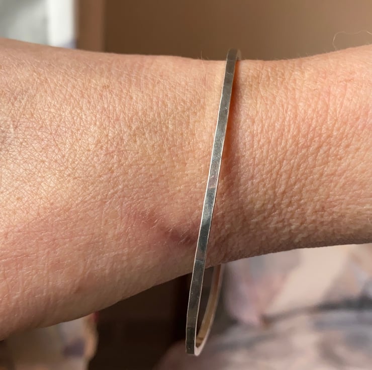 A simple bangle but the square wire gives it a different look to the round wire bangles. It is hammered on the top and both side edges which makes it catch the light beautifully.