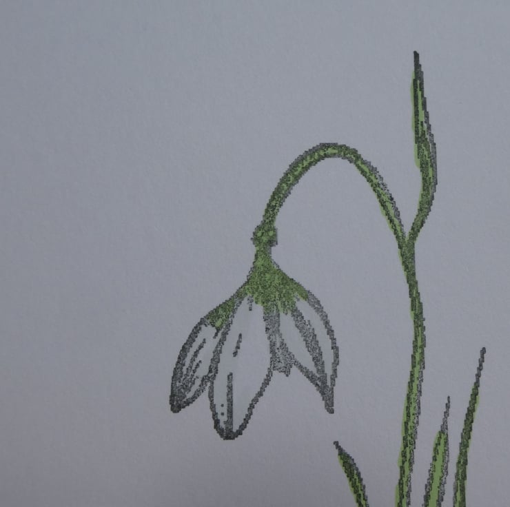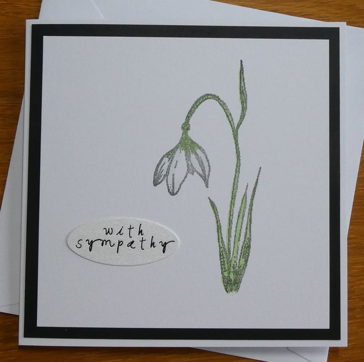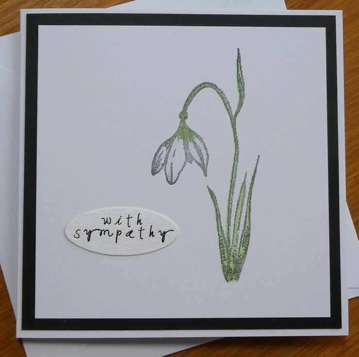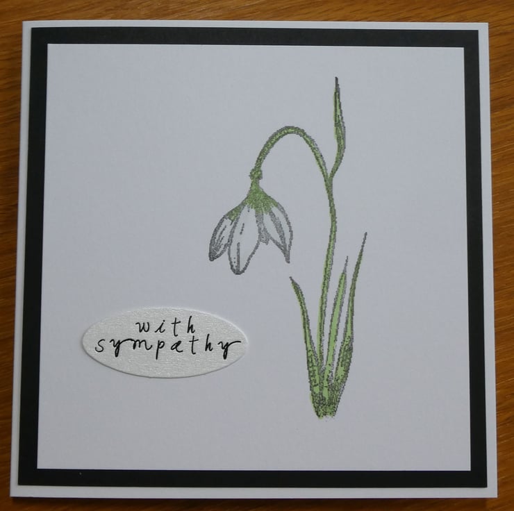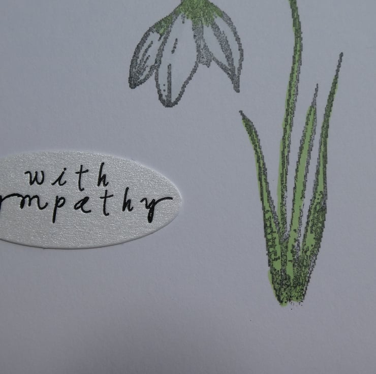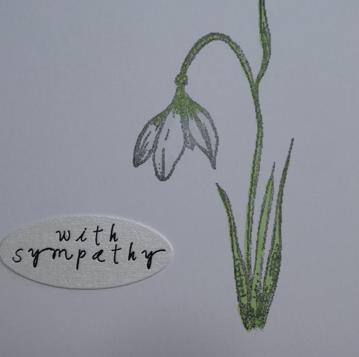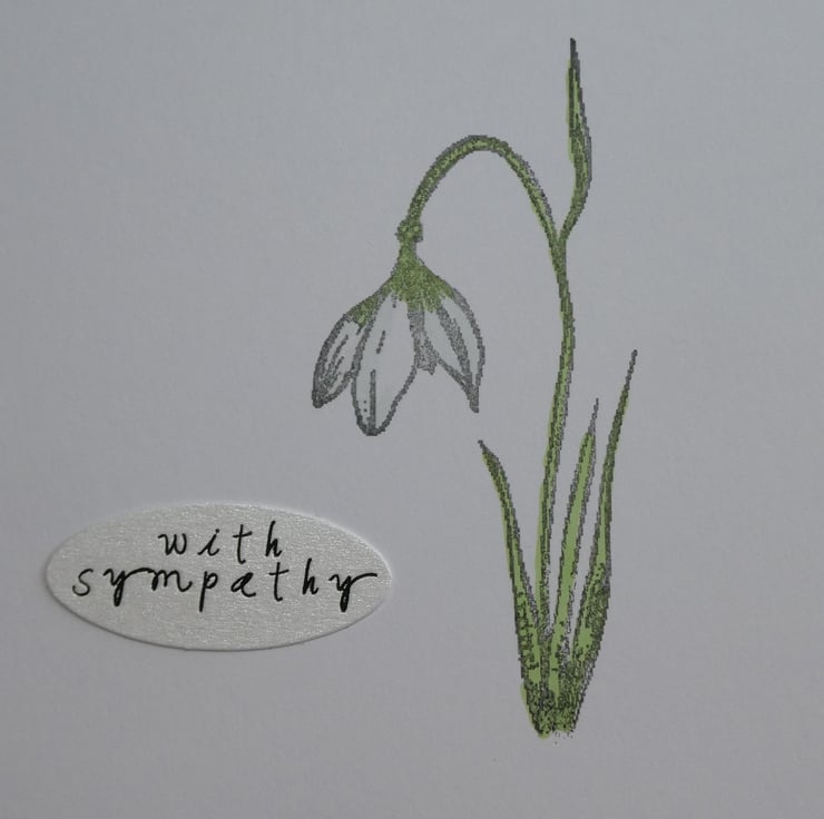 This simple sympathy card card features a hand stamped and coloured snowdrop in subtle shades of green, ice blue and white.