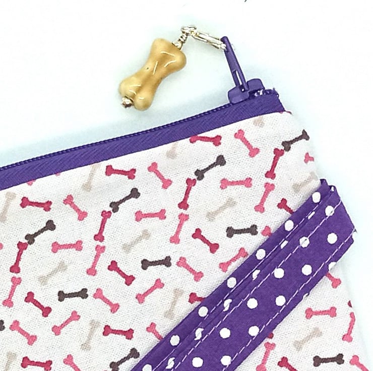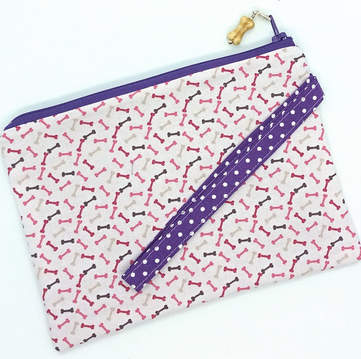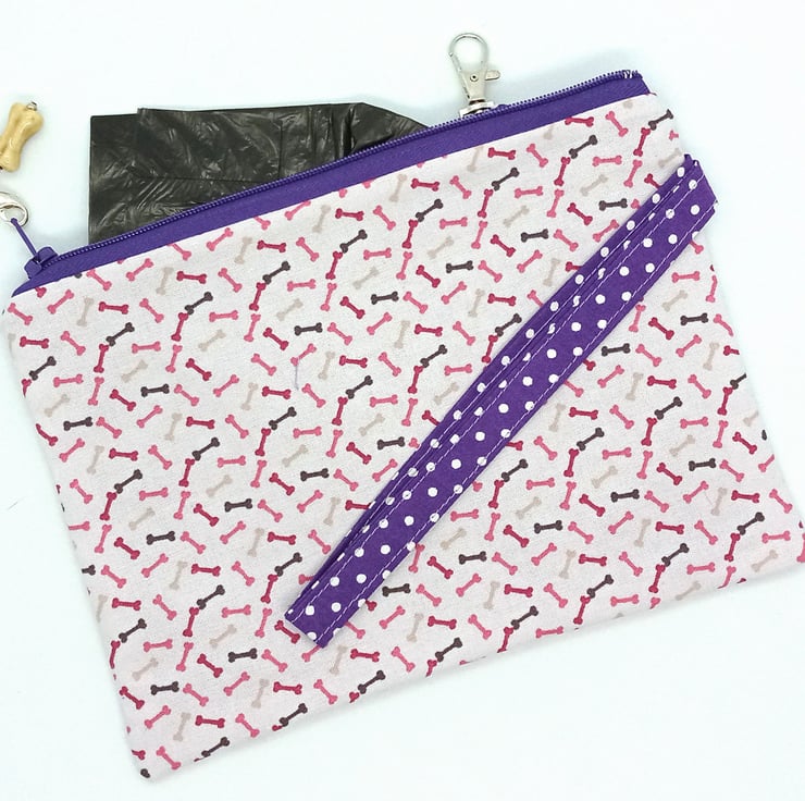 A 19 x 14 cm lined pouch to keep those little black bags handy on your daily walk. This will look so much better than having your pockets stuffed with poo bags. The lining is purple and white spotted cotton as the wristlet and the zip.