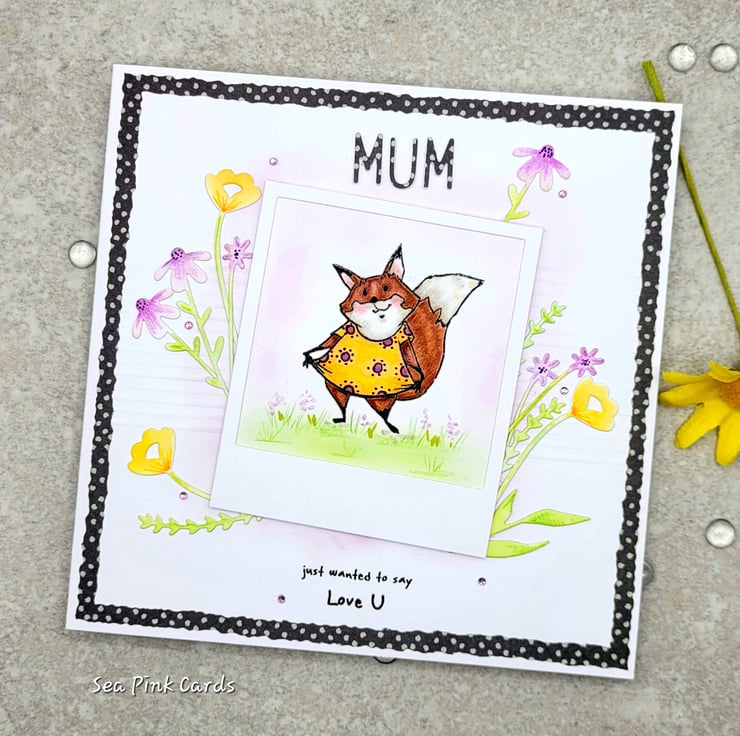 MUM has been spelt out in die-cut letters, from patterned paper and the small stamped sentiment is in handwritten style font. The little fox is stamped by hand and heat embossed, then coloured using artist grade pens and pencils. I've embossed lines and die cut flowers, to add to the texture and detail. There are tiny pink crystals on the front for a little sparkle.