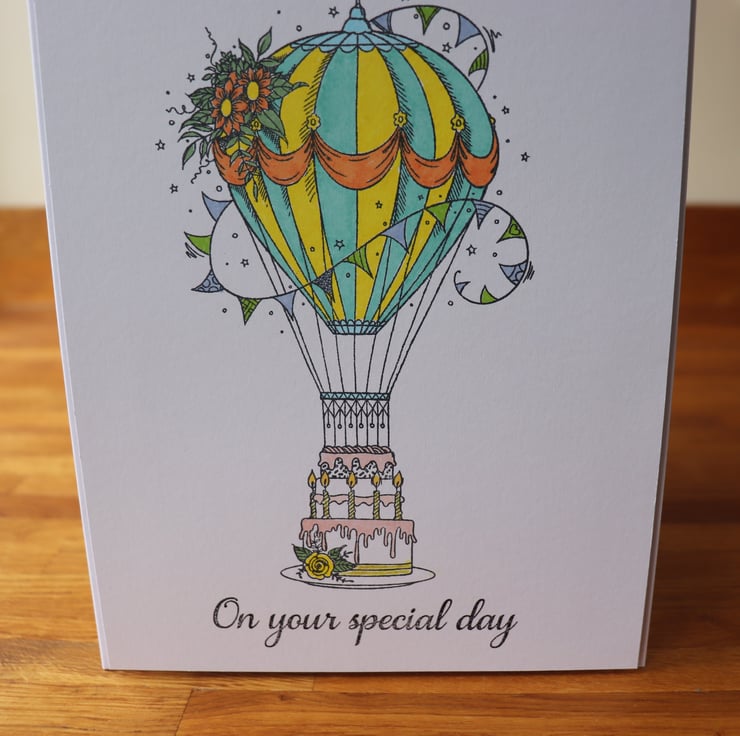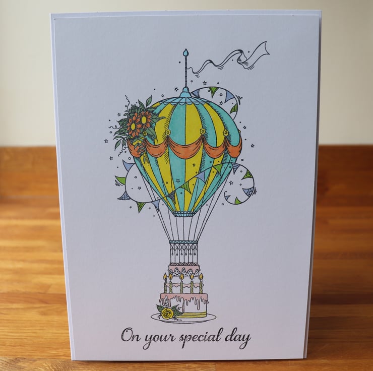 this card is blank inside for your special message, plus in the bottom right hand corner there is a small hot air balloon to make it more special.