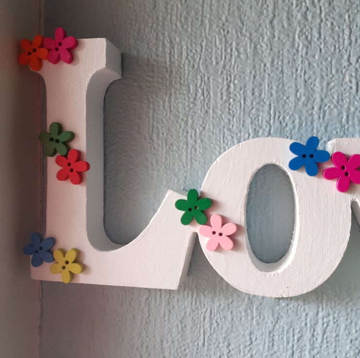 Hand painted with white gesso, two layers of white acrylic paint and adorned with wooden flowers of different colours.