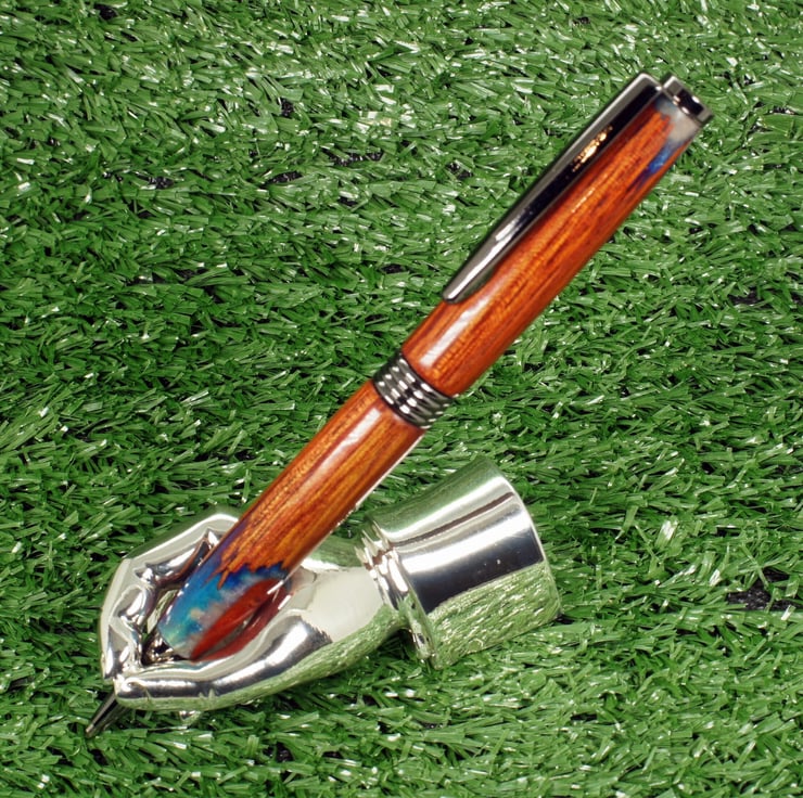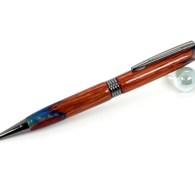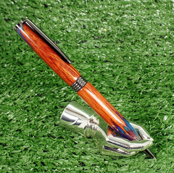 This pen was hand turned by me in my workshop in Bures, Suffolk, the metal parts are dark chrome gunmetal finish, Included in the price is a black card presentation box