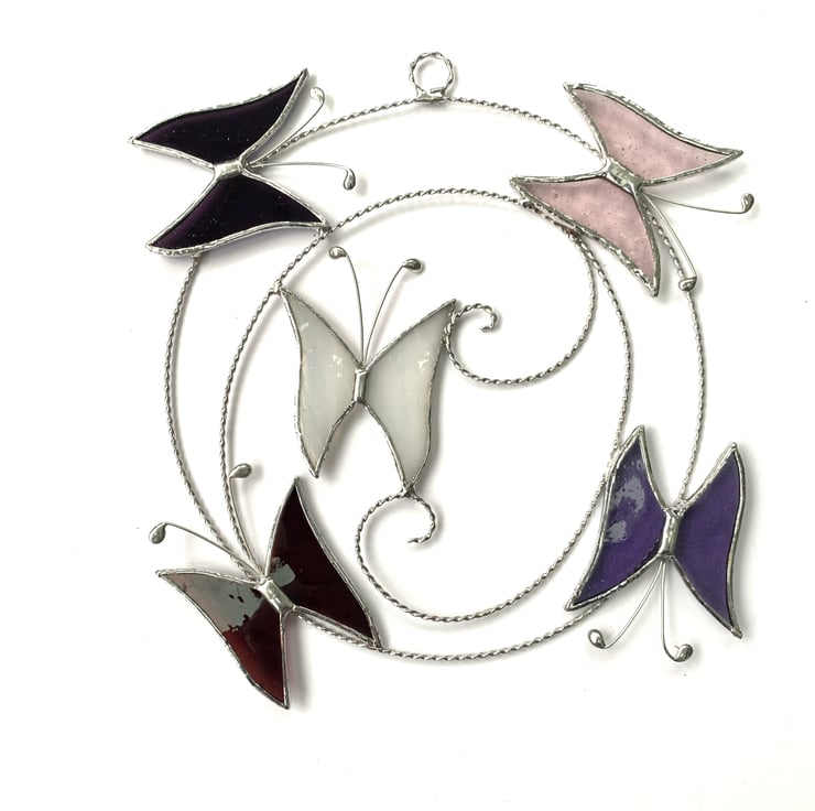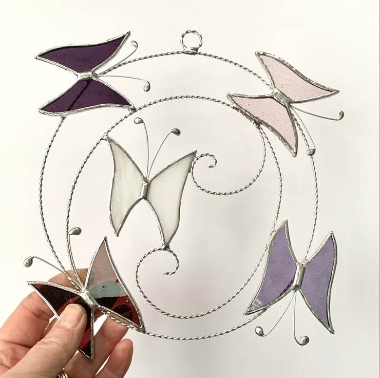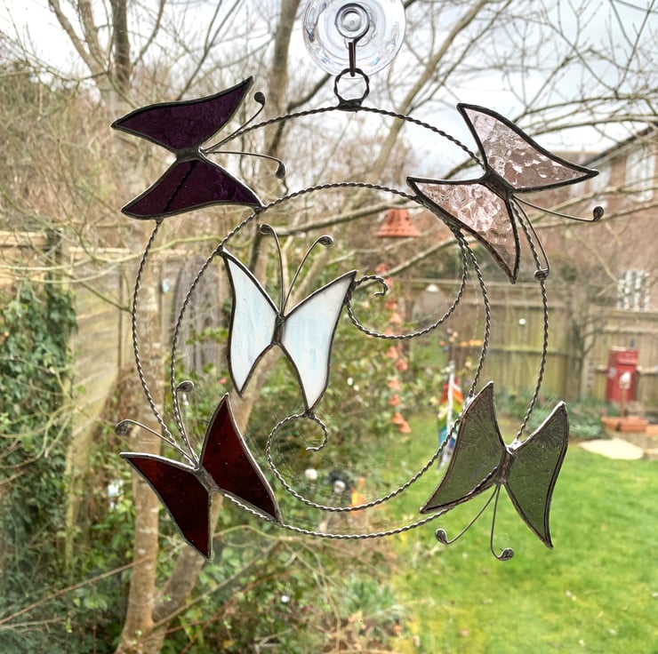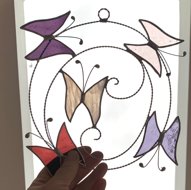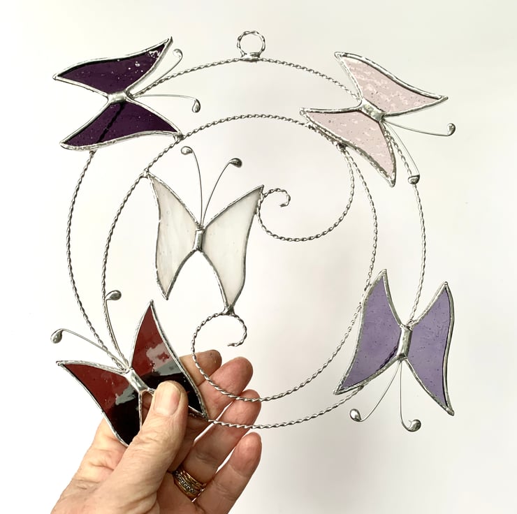 Each butterfly measures 5.5cms x 6cms approx, the wire circle is approx 17cms but the overall size of this suncatcher is 22cm because of how I arrange the butterflies - this is an approximate measurement as being made by hand the circle is not perfectly round.