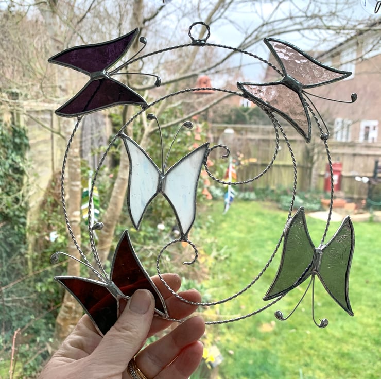 Each butterfly has been hand cut from beautiful stained glass so it will not fade in the sun, the glass is ground to take off any sharp edges, washed and foiled then tinned before the pieces are soldered together to form a lovely suncatcher. The antenna are made from tinned copper wire. A small ring and length of fishing line have been attached for hanging purposes.
