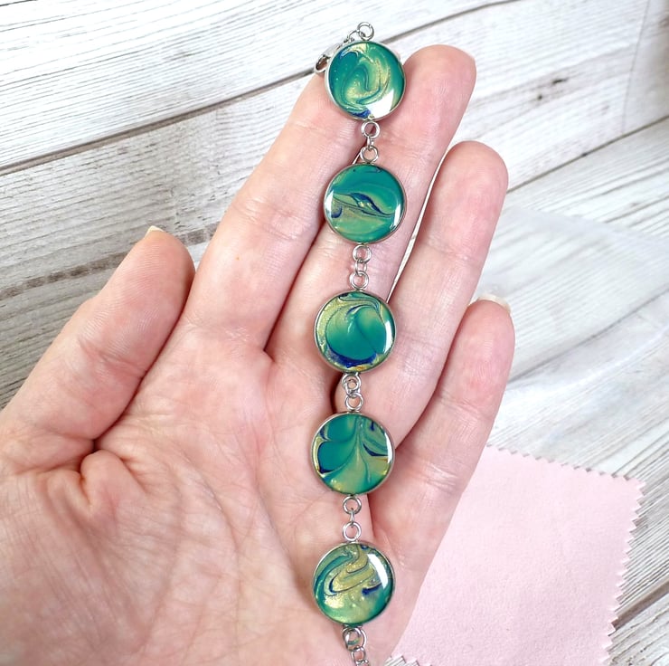 One of a kind gold and sea-green enamel bracelet with just a touch of deep blue, this swirl bracelet is totally unique. The bracelet itself is hypoallergenic stainless steel and the enamelled bezels are sealed with clear resin for protection and to enhance the colours. Dainty, lightweight and slinky to wear