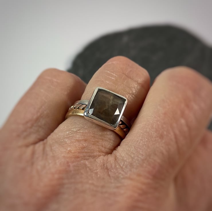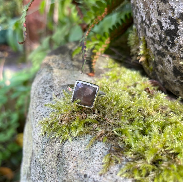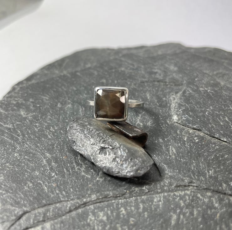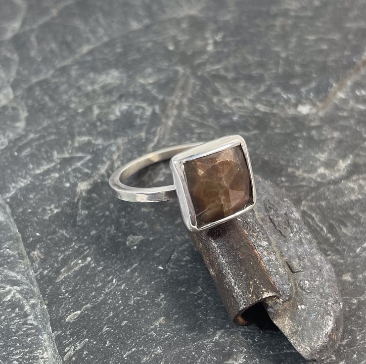 The stone is an opaque brown colour, is has large facets that catch the light, it has a lovely chatoyantcy in certain lights. The stone with setting measures about 10mm.