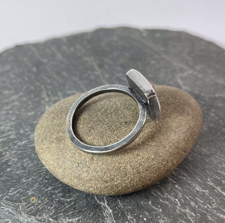 A fine ring, the shank is only 1.5mm wide allowing it to be stacked with other slim bands, should you wish. The silver has been oxidised dark, but rubbed back bright around the stone.