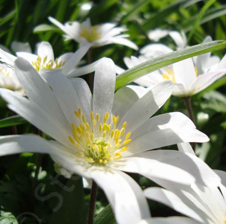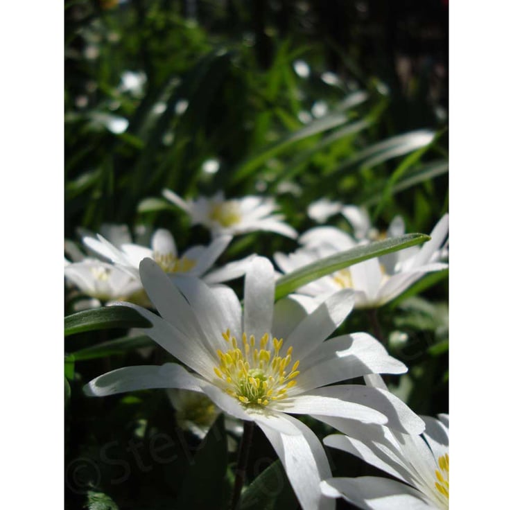 A photographic print of a lovely springtime scene, a carpet of flowering white anemones on a beautiful sunny day.