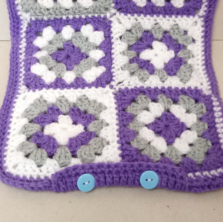 Handmade in purple, white & grey granny squares with a purple edging and top,