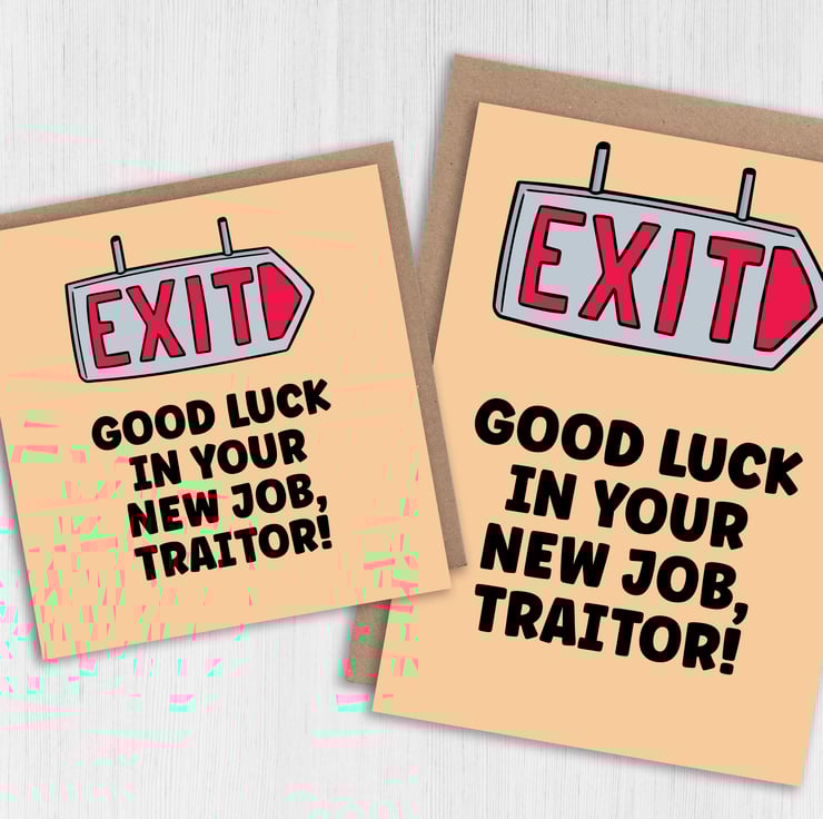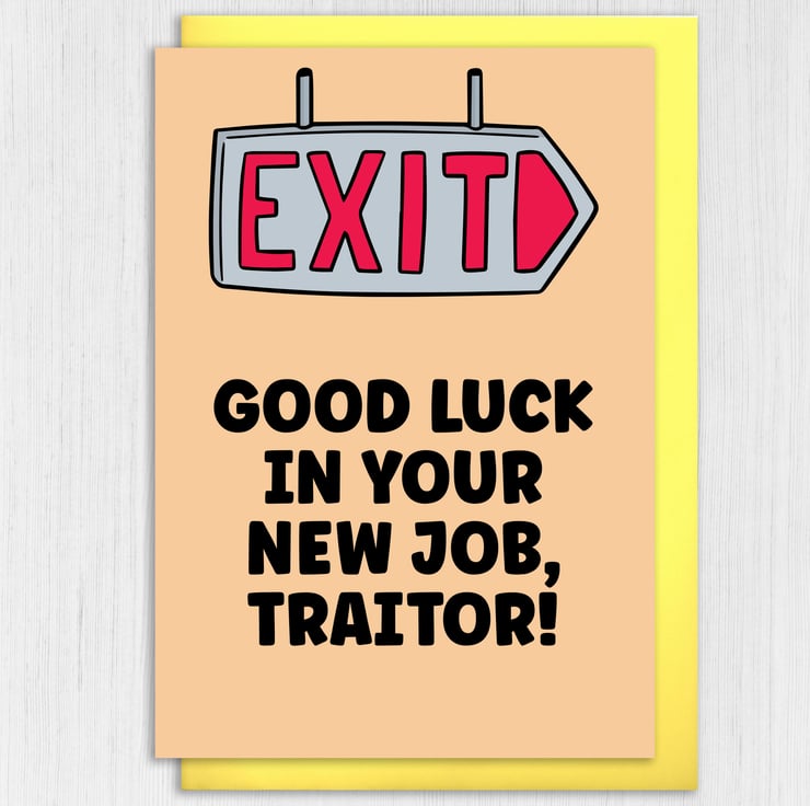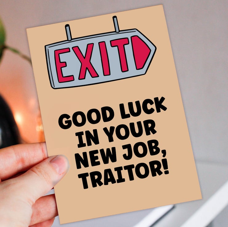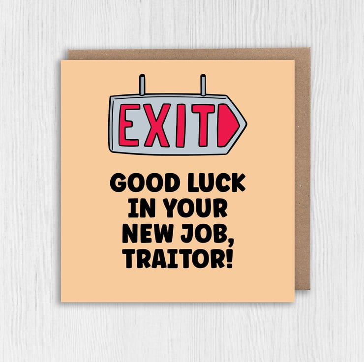 Funny rude, exit sign, new job congratulations card: Good luck in your new job traitor! (Size A6/A5/A4/Square 6x6")