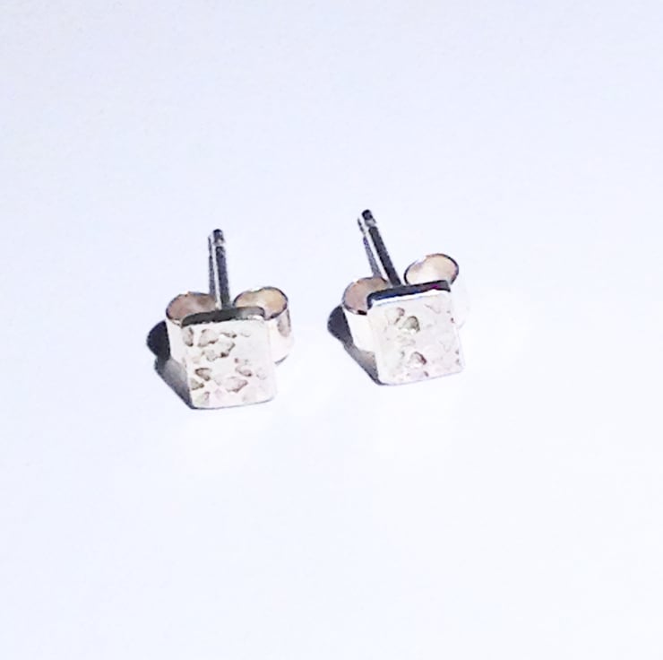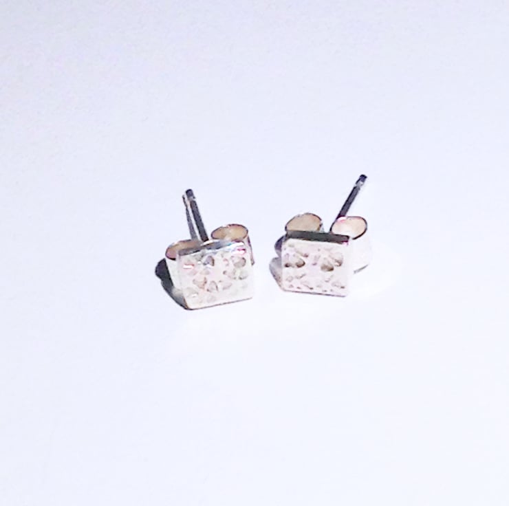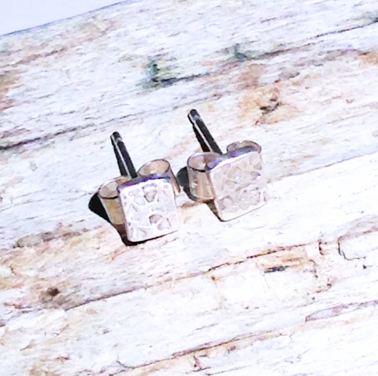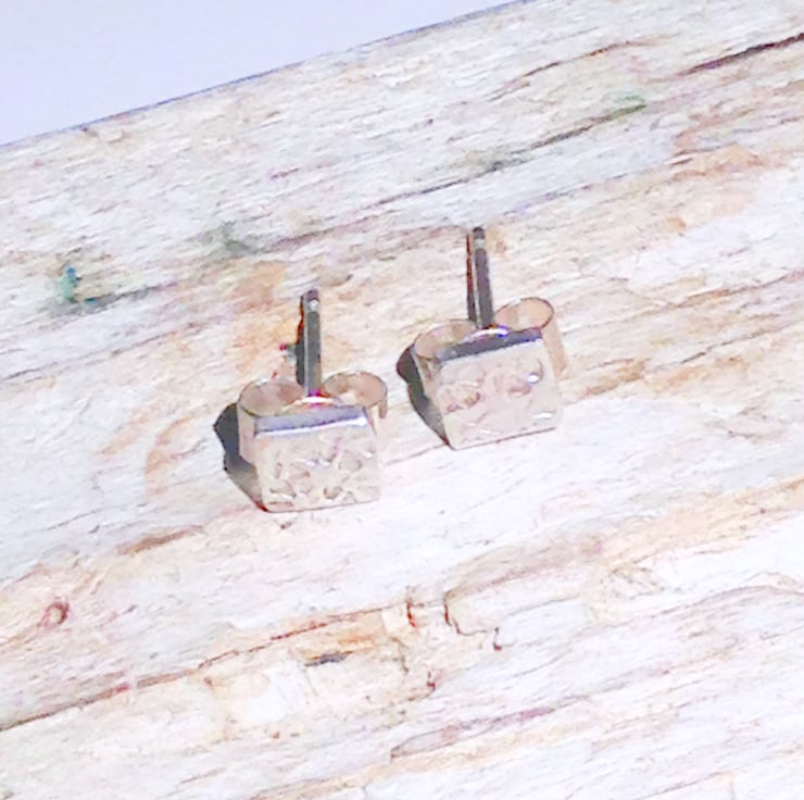 The earrings measure approximately 4.7 x 4.1 x 1.3 mm and I have soldered on sterling silver earring posts with scroll backs.