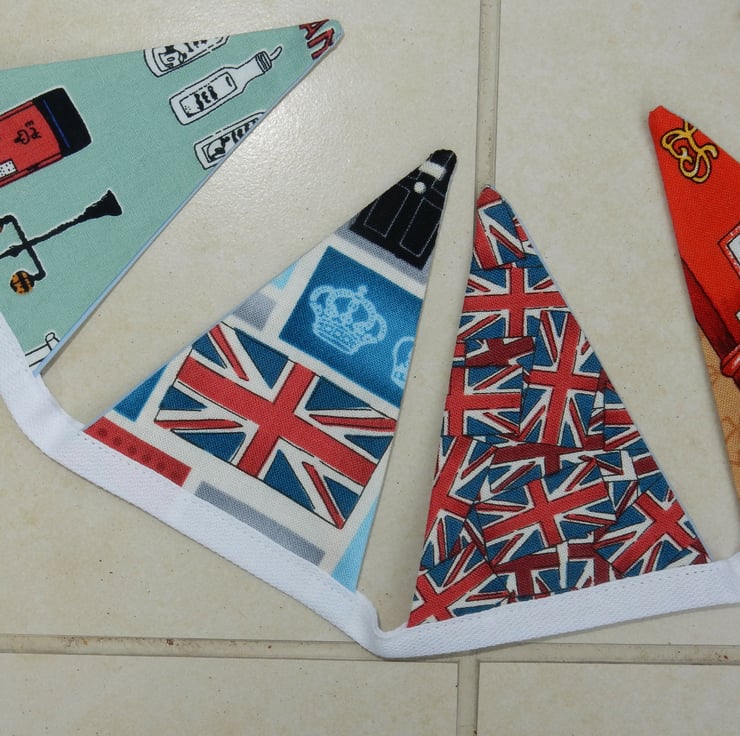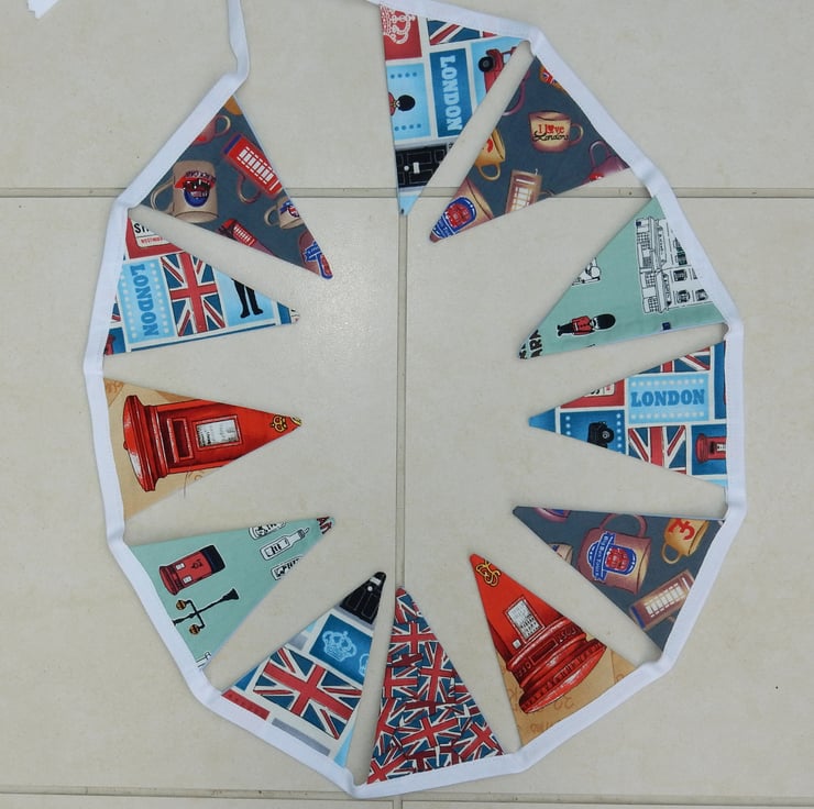 This mini bunting is a little smaller but equally effective. It is made from a selection of patriotic themed fabrics, including Union Jacks, post boxes, tea cups and crowns, and backed with pale blue fabric. The flags are therefore double sided which helps them to hang well. The white tape measures 1.5 metres total, with the measurement from first to last flag being approx. 108 cm (42 inches). This gives a generous length of bunting, with ties at each end for hanging. Each of the 12 flags is 11cm (4 inches) deep.