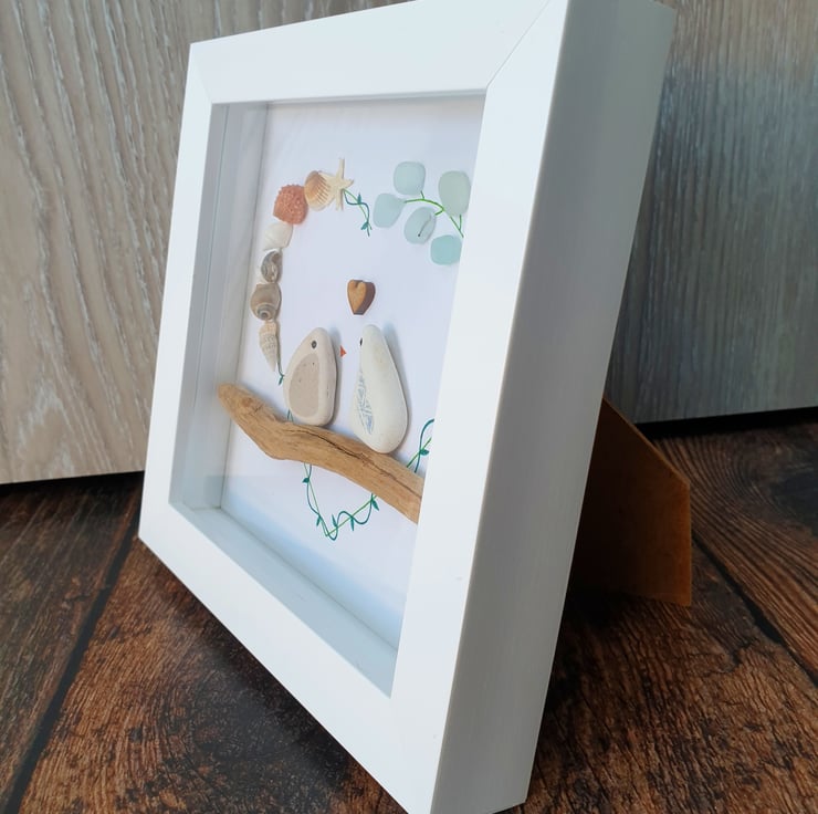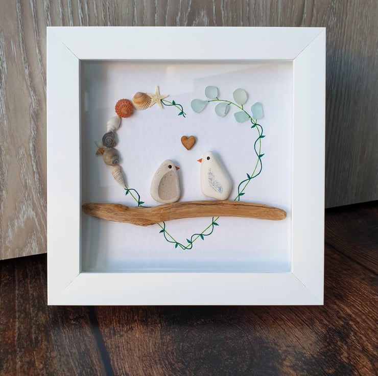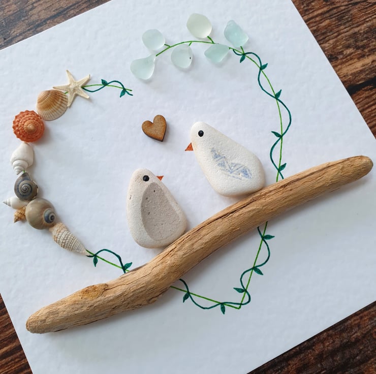 Beach inspired artwork with a touch of bohemian vibe of two lovebirds created with genuine sea glass, seashells, sea pottery and driftwood on recycled textured card.
