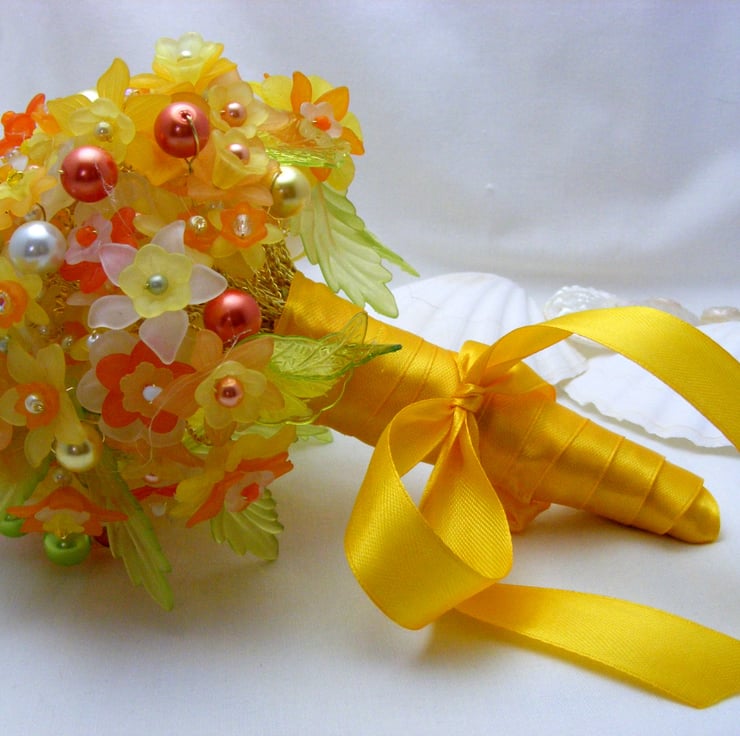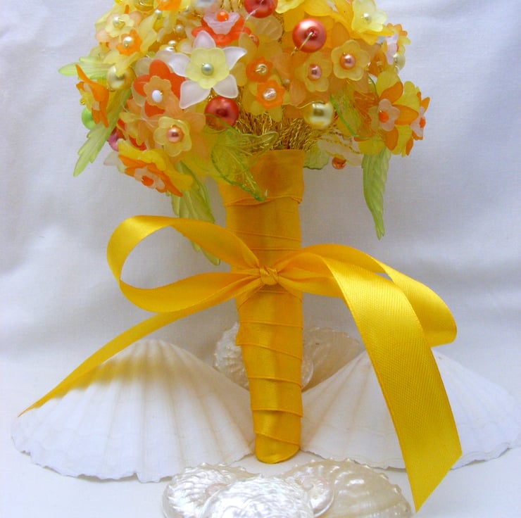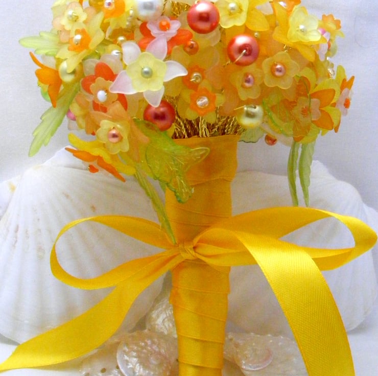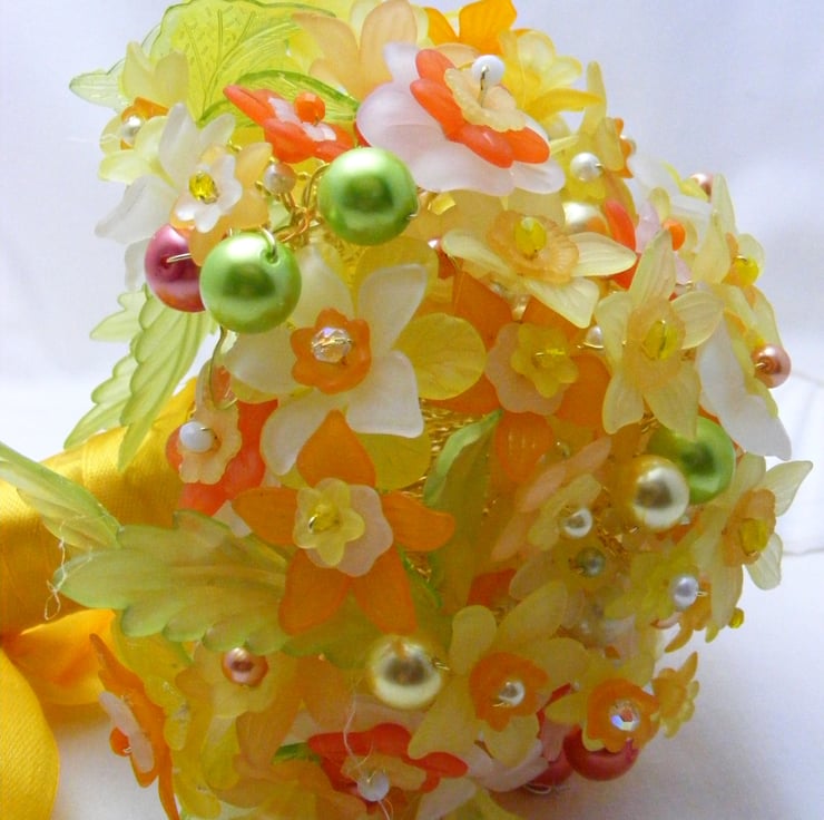 I've handmade this one of a kind bouquet with, 35mm, 27mm,17mm, 12mm, 10x14mm and 10mm yellow Lucite flowers, 30mm, 27mm, 15mm, 12mm and 10mm white Lucite flowers, 27mm, 20mm and 10mm orange Lucite flowers, 14mm orange, yellow, white and lime green glass pearls, 12mm lemon glass pearls, 4mm white and pale green glass pearls, 4mm lemon and orange fire polish glass beads, 6mm orange glass pearls, 6mm clear fire polish beads, 3mm white glass rondelles, 50x16mm spring green Lucite leaves, 35x20mm spring green Lucite leaves, gold plated wire, yellow ribbon and glue.