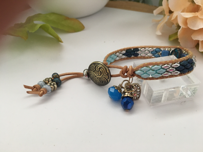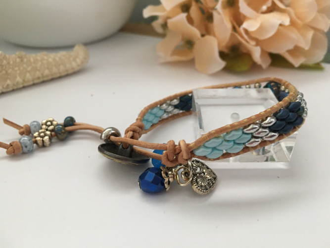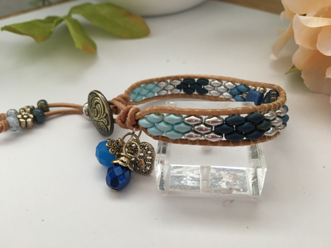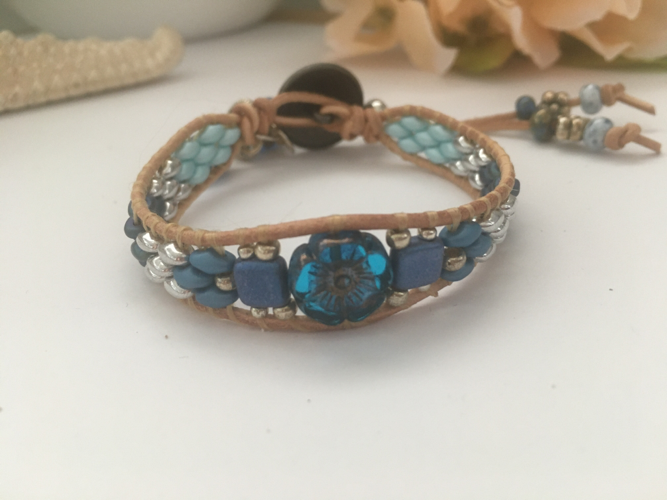 To create this design I have lovingly woven a selection of Czech Super duo, Czech mate tiled beads and tiny seed glass beads onto 1.5 mm soft Italian leather cord. In the centre a Blue Czech Hawaiian flower bead proudly sits. Czech beads are considered to be of the highest quality for durability and depth of colour.
