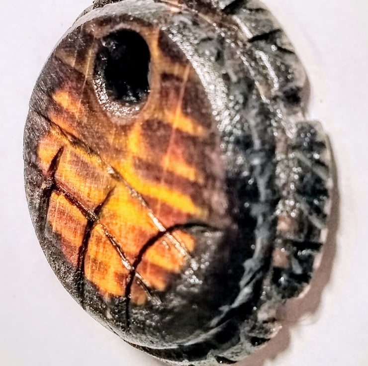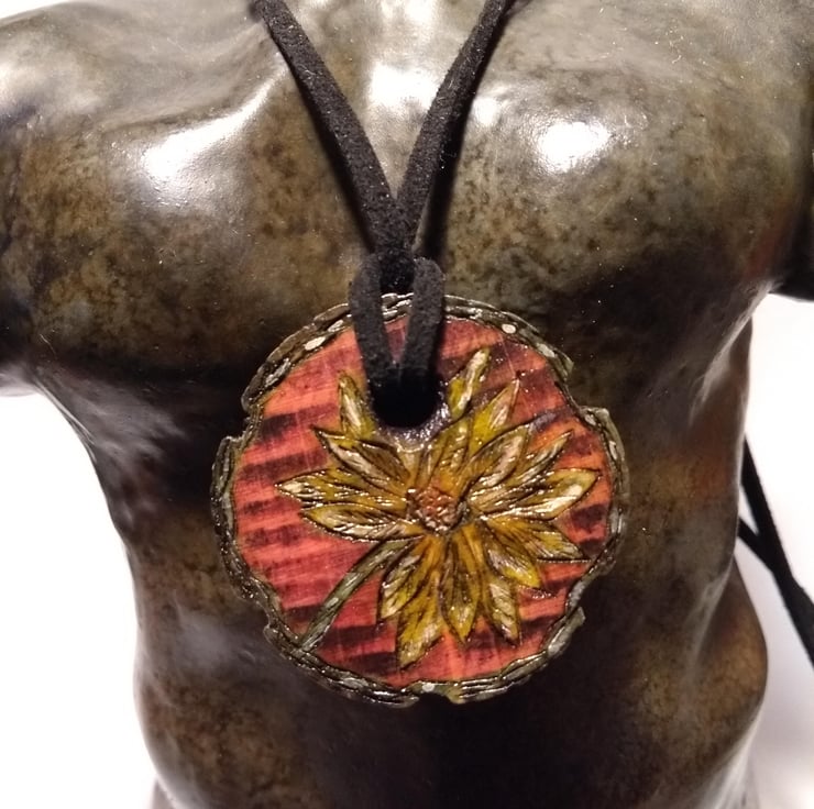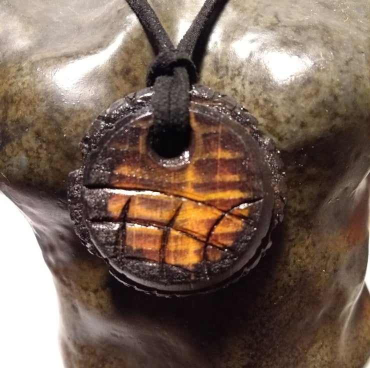 A Hardwood artefact that has been "off-center" turned on one side on my lathe, making attractive cuts with a sharp tool and decorated on the other to be used either as a Pendant or totem. (My thoughts that you may choose to add beads or other items to a knotted thong, or use it as a totem or key ring if you wish by making the cord shorter). Approx. 37 mm diameter and approx. 8mm thick. The wood grain has been accentuated with dyes and sanding techniques.