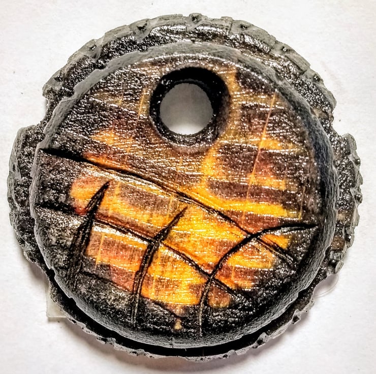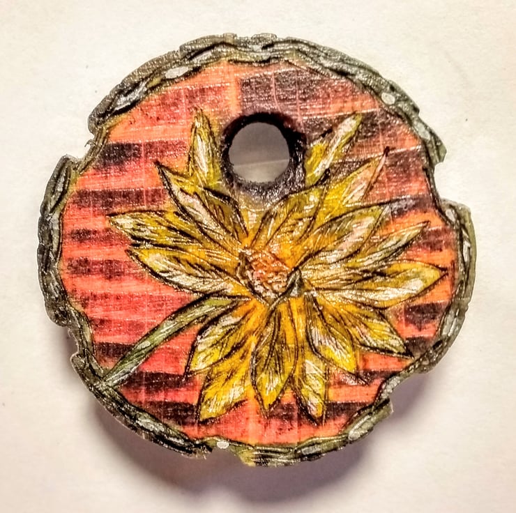 A Hardwood artefact that has been "off-center" turned on one side on my lathe, making attractive cuts with a sharp tool and decorated on the other to be used either as a Pendant or totem. (My thoughts that you may choose to add beads or other items to a knotted thong, or use it as a totem or key ring if you wish by making the cord shorter). Approx. 40 mm diameter and approx. 5mm thick. The wood grain has been accentuated with dyes and sanding techniques.