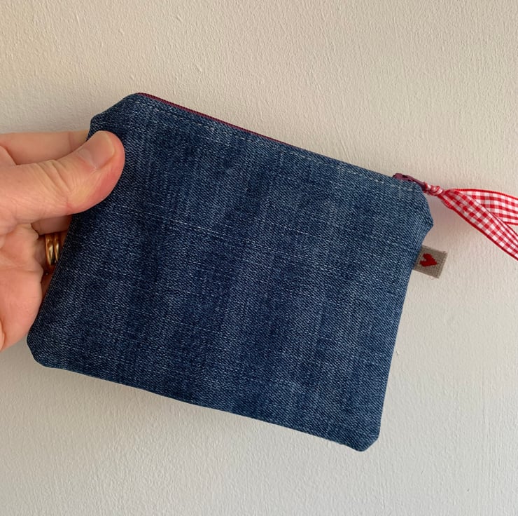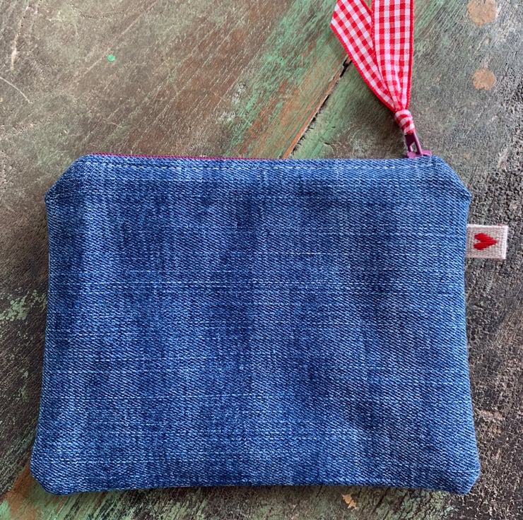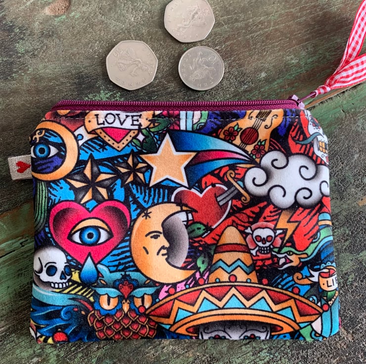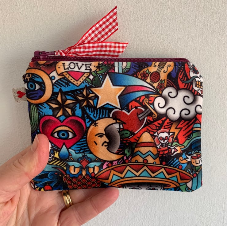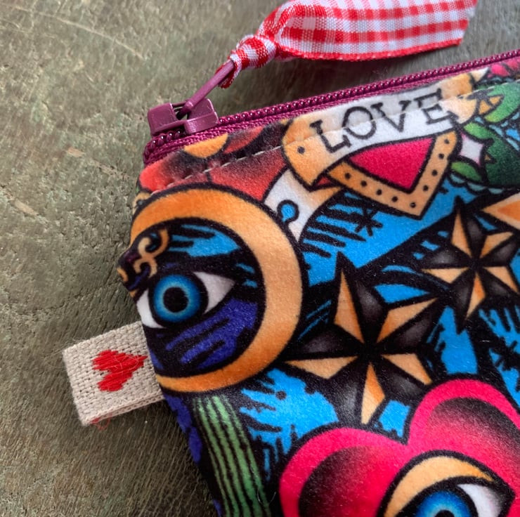 Cute little coin purse made from tattoo print velvet. It is backed with reclaimed denim and lined with blue cotton.