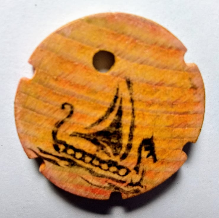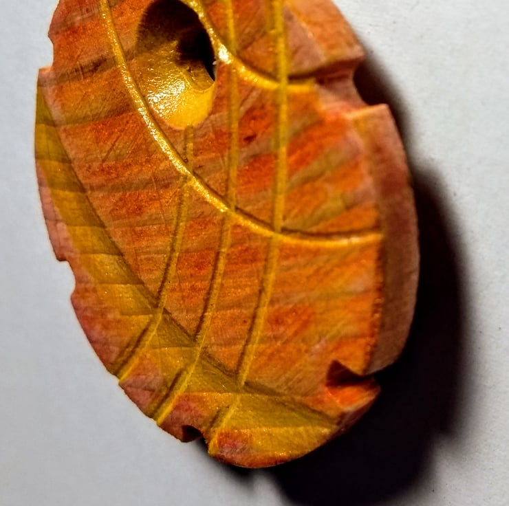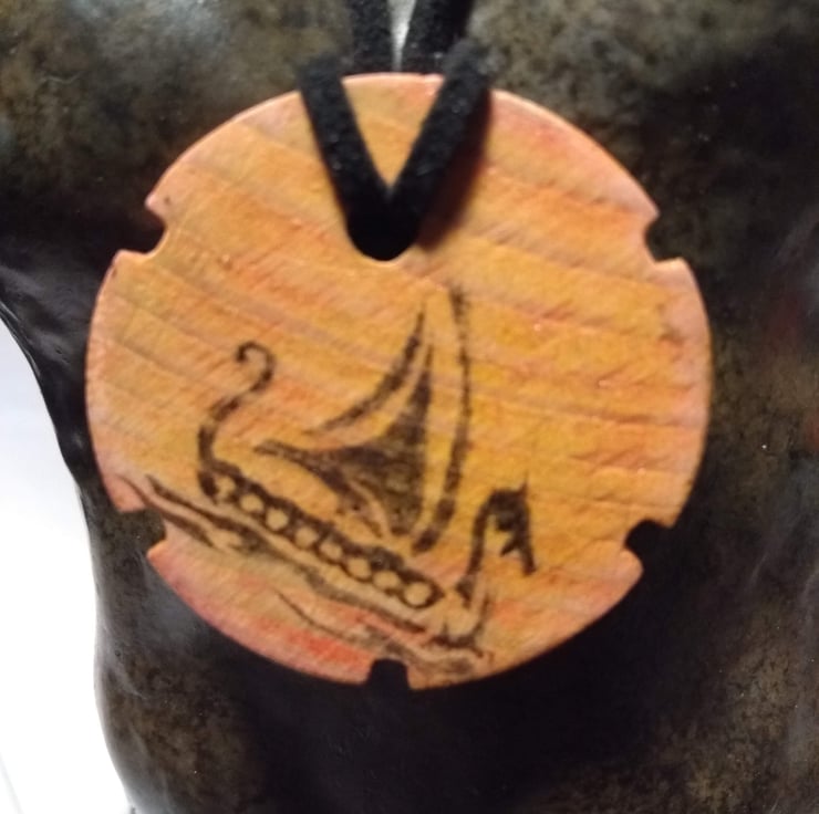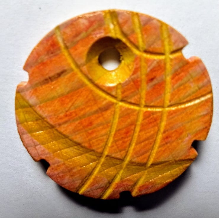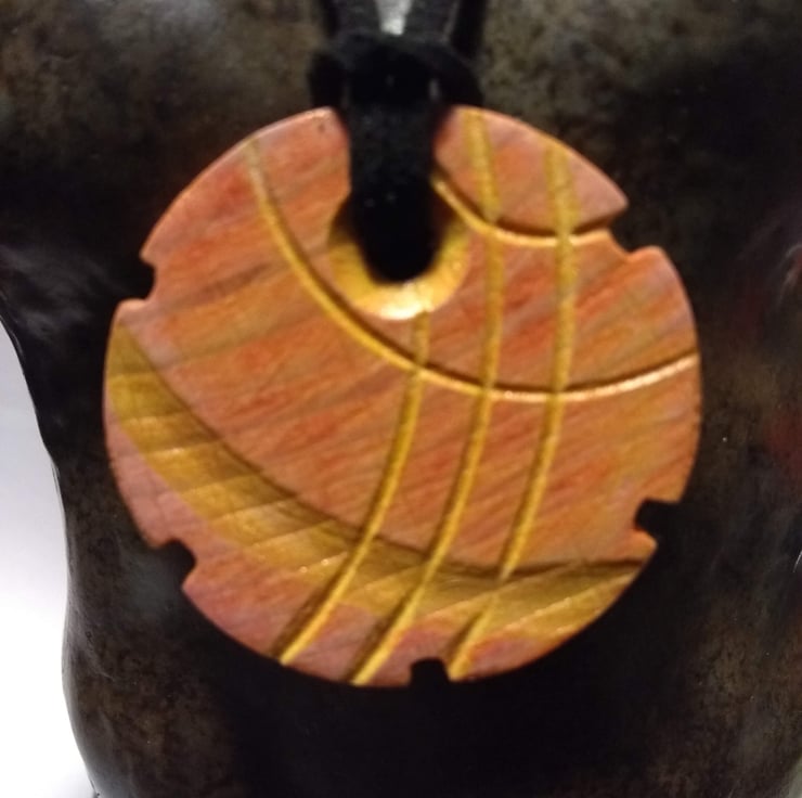 A Hardwood artefact that has been "off-center" turned on one side on my lathe, making attractive cuts with a sharp tool and decorated on the other to be used either as a Pendant or totem. (My thoughts that you may choose to add beads or other items to a knotted thong, or use it as a totem or key ring if you wish by making the cord shorter). Approx. 40 mm diameter and approx. 5mm thick. The wood grain has been accentuated with dyes and sanding techniques.