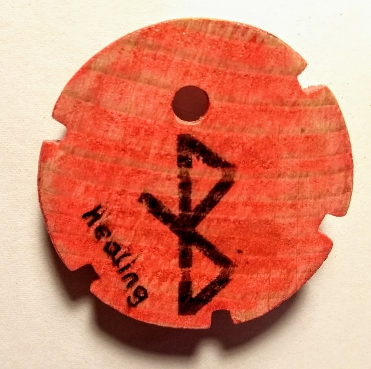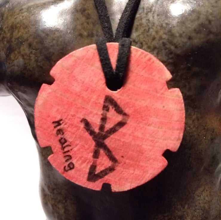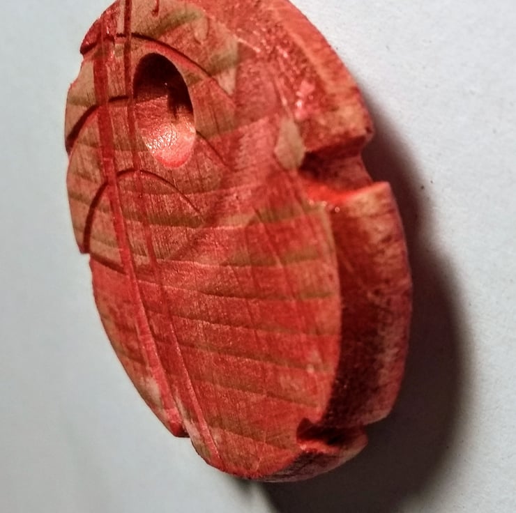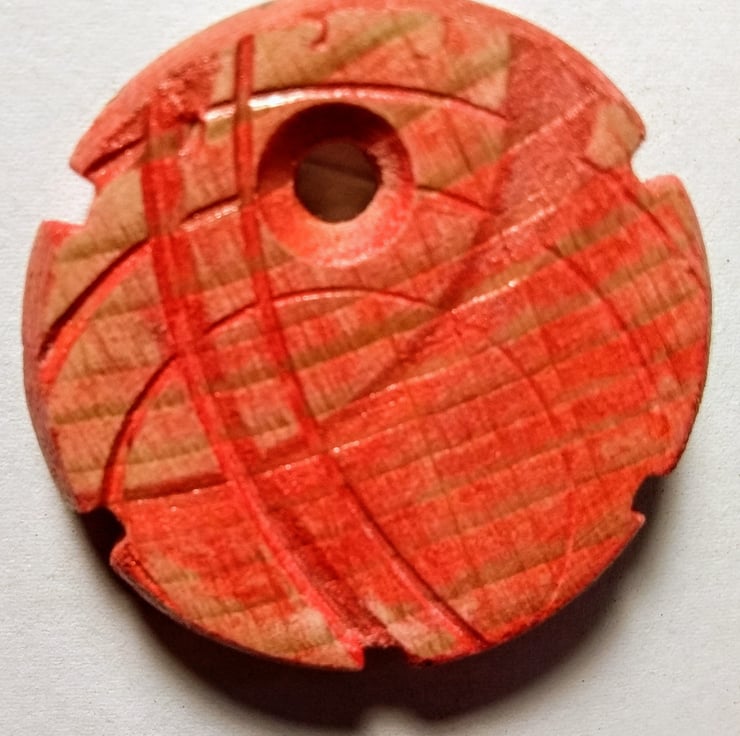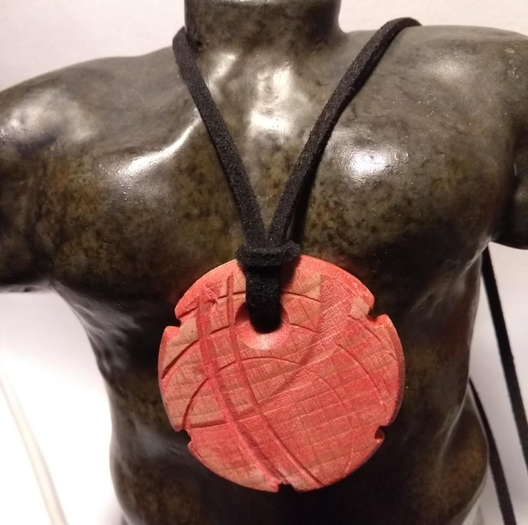 A Hardwood artefact that has been "off-center" turned on one side on my lathe, making attractive cuts with a sharp tool and decorated on the other to be used either as a Pendant or totem. (My thoughts that you may choose to add beads or other items to a knotted thong, or use it as a totem or key ring if you wish by making the cord shorter). Approx. 40 mm diameter and approx. 2mm thick. The wood grain has been accentuated with dyes and sanding techniques.