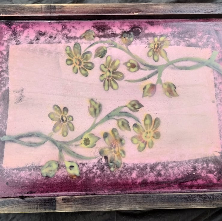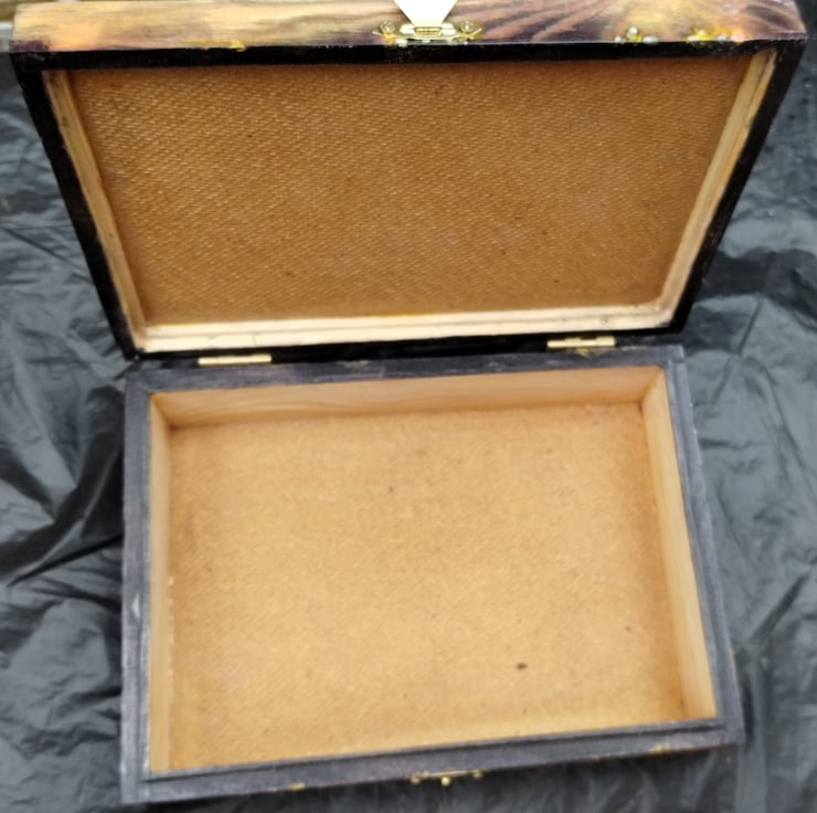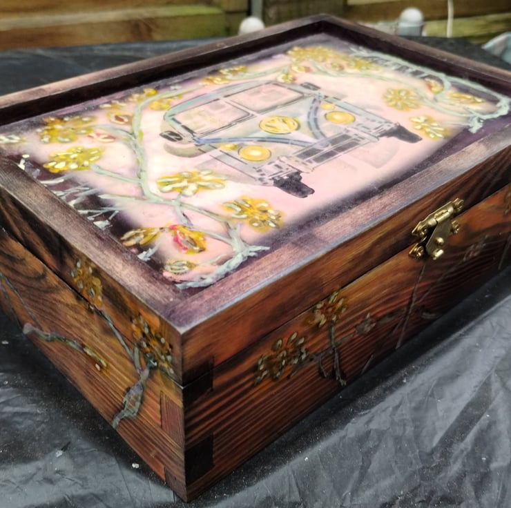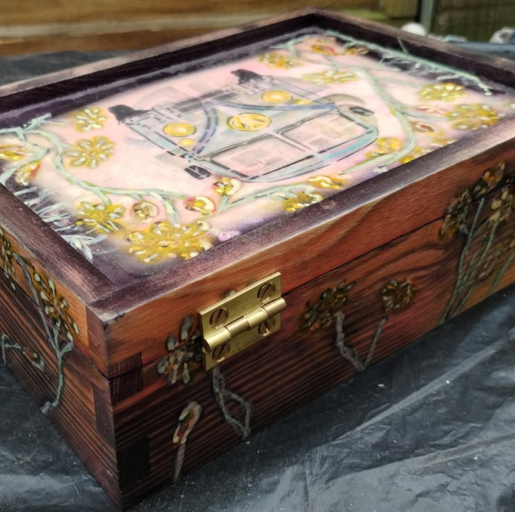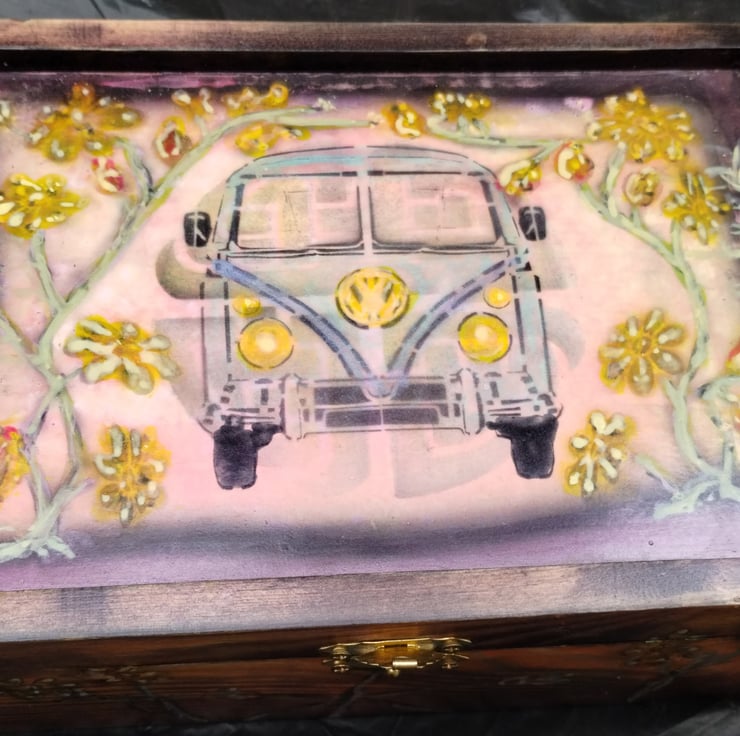 A pine box with a VW camper stencil as the main item airbrushed onto the melamine hardboard that makes the top lid. Wood stains and acrylic paints with acrylic lacquer allowed the wood grain of the pine to shine through the stencil and hand painted flowers and decorations. I am tempted to line the inside, but would rather let the new owner have some fun. approx 65mm x 210mm x150mm.