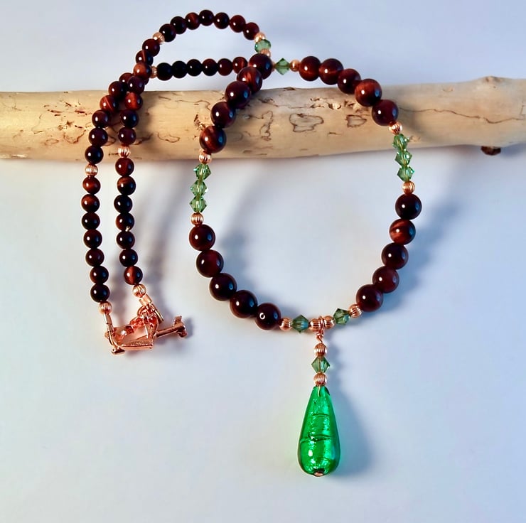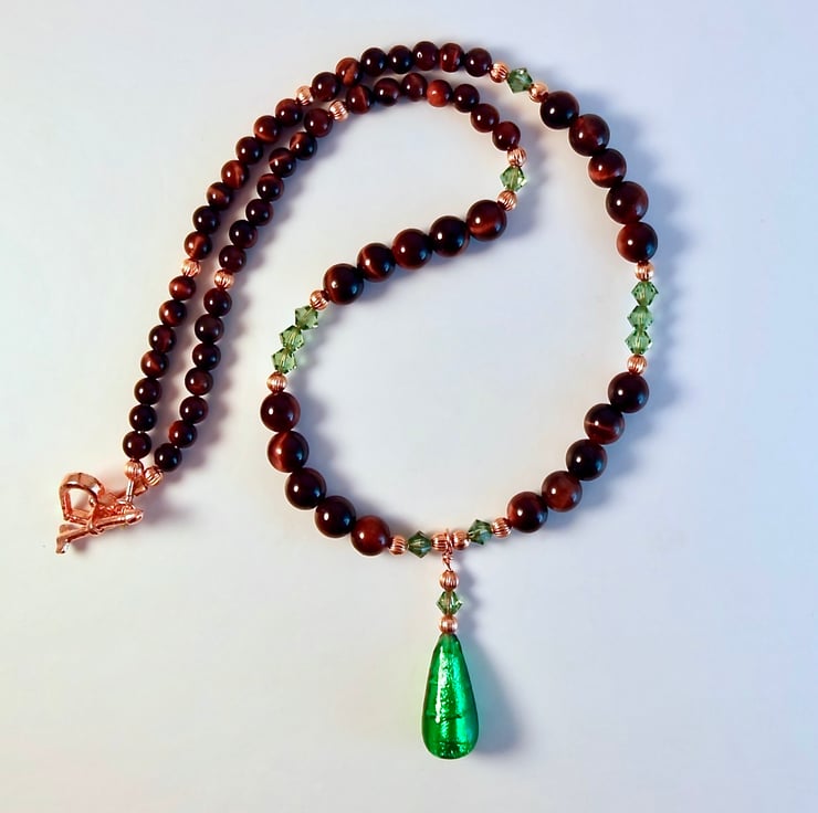 The pendant is set between copper and Swarovski crystal, and 6mm red Tiger's Eye beads.