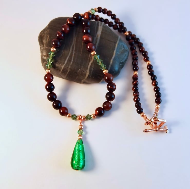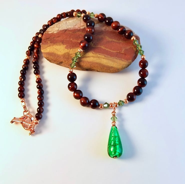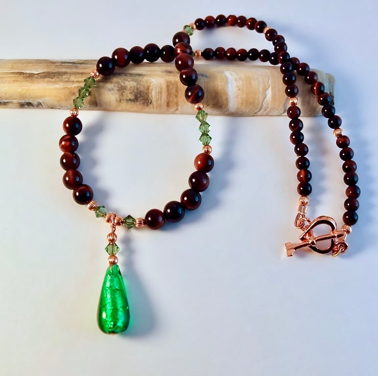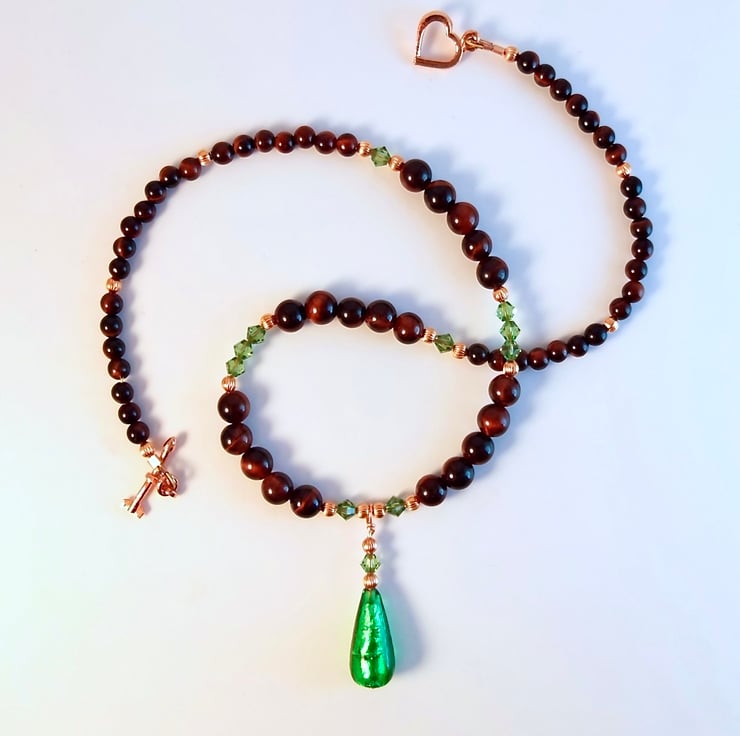 The pendant is set between copper and Swarovski crystal, and 6mm red Tiger's Eye beads.
