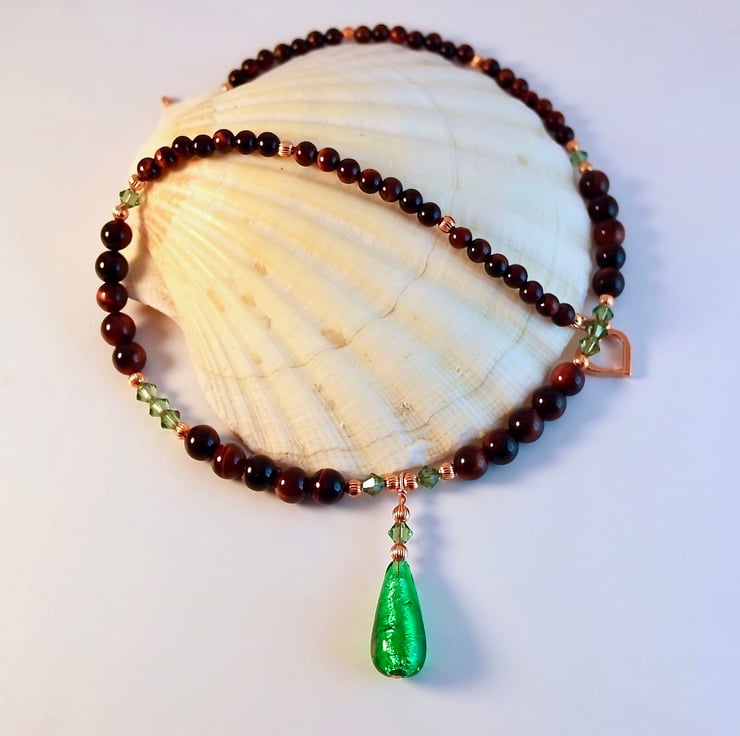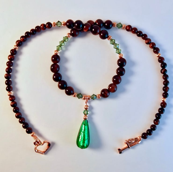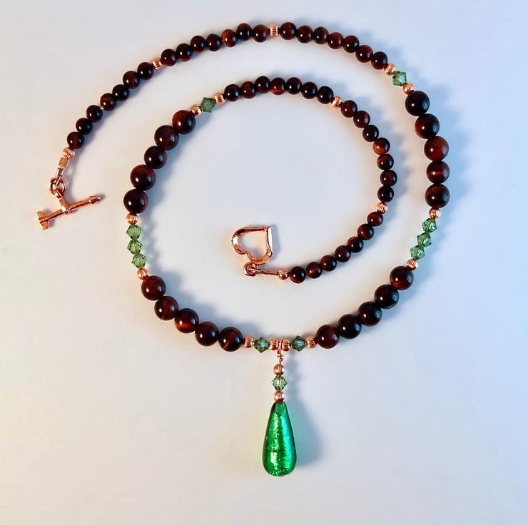 The necklace graduates to 4mm red Tiger's Eye and 3mm corrugated copper rounds, and finishes with a copper heart-shaped toggle clasp.