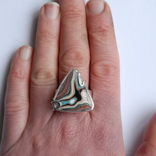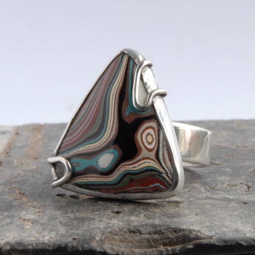 There is a flaw in the fordite but I am confident that it will survive many years of wearing. If it does fail I will happily unset it and replace it with a new piece of fordite cut and polished from whatever rough I have in stock at the time (you get to pick your favourite).