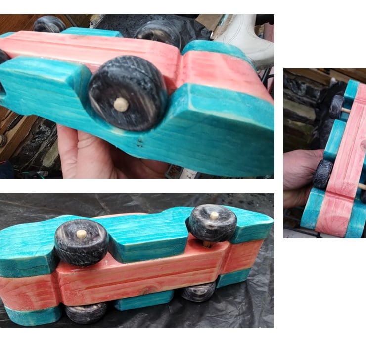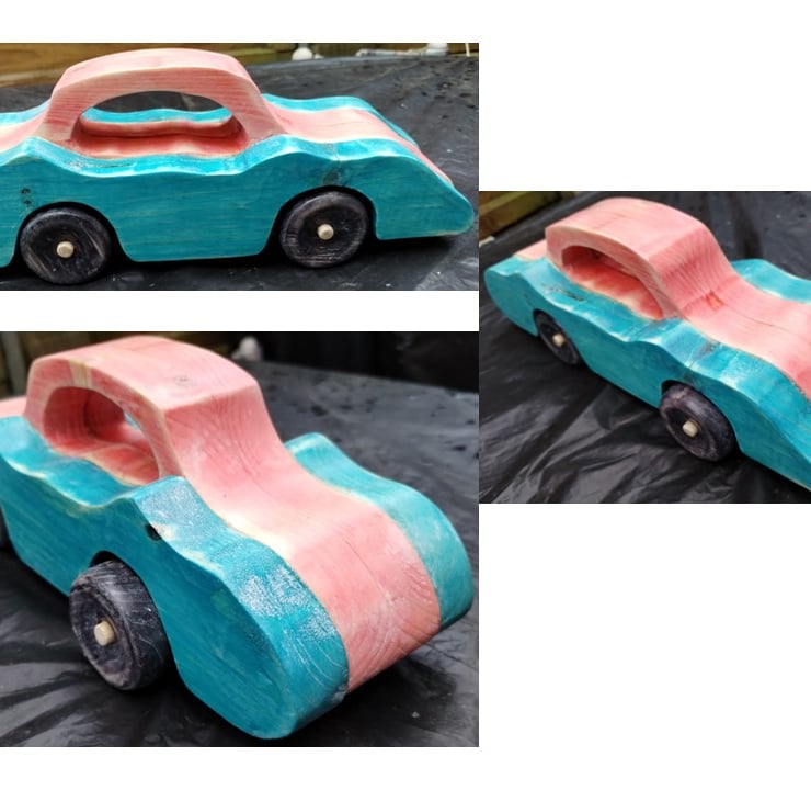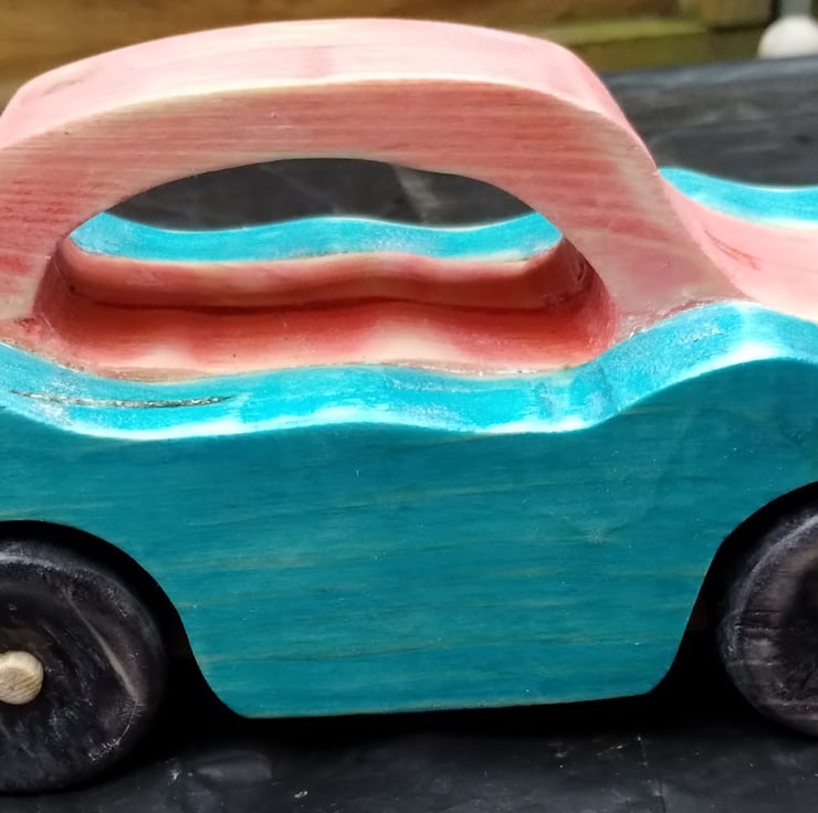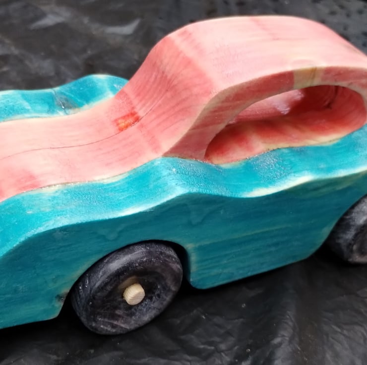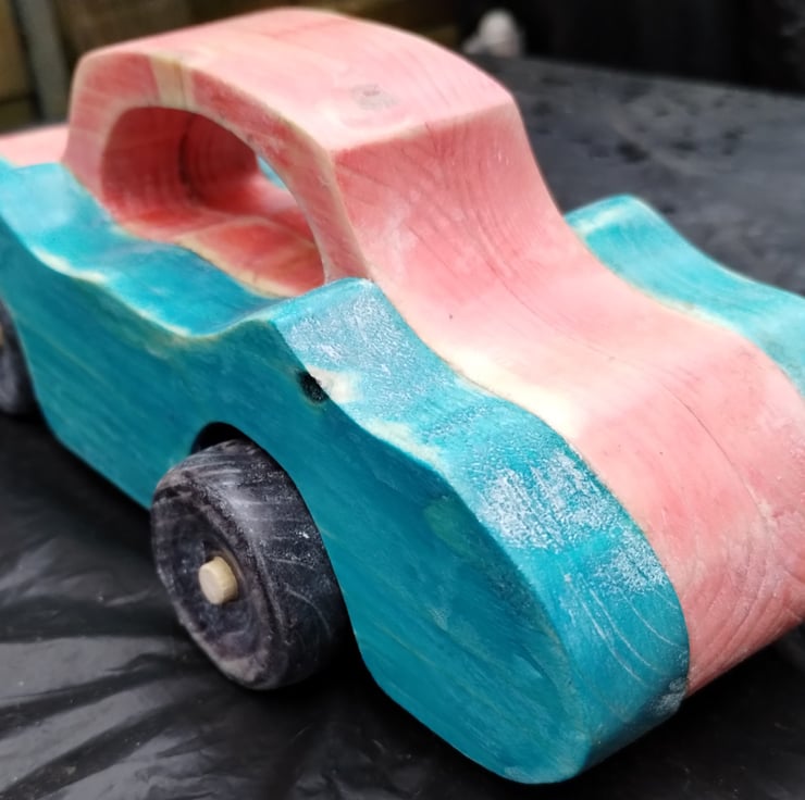a wooden car, 230 x 80 x 85 mm, the idea was to use spirit stain to allow the wood grain to show through. The wheels turn and it is finished in "chestnut acrylic lacquer" which is toy safe. (It is probably not suitable for children under 36 months as it is pine wood...so could splinter if chewed), but I see it more as an ornament...it has sat on the shelf in my mancave looking rather cool for a few months now...so thought to offer it out, so I can make some more...