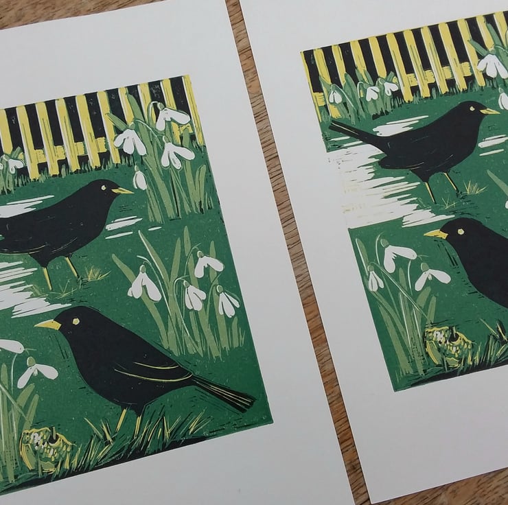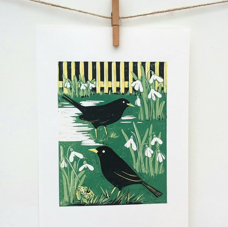 Each month last year I made a print inspired by flowers and plants I saw around me - a great way to take notice of the changing seasons. I am continuing with a print for each month but this year I am finding inspiration in the birds I see. The snowdrops in our garden are spreading every year under and around the apple tree. The remainder of the fallen apples provide food for the blackbirds during the winter months.