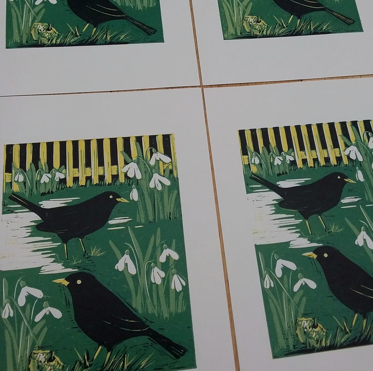 'Good Morning Mr Blackbird' - a four colour reduction linoprint in yellow, black and green.