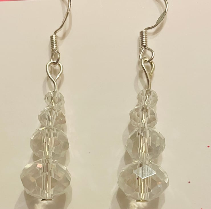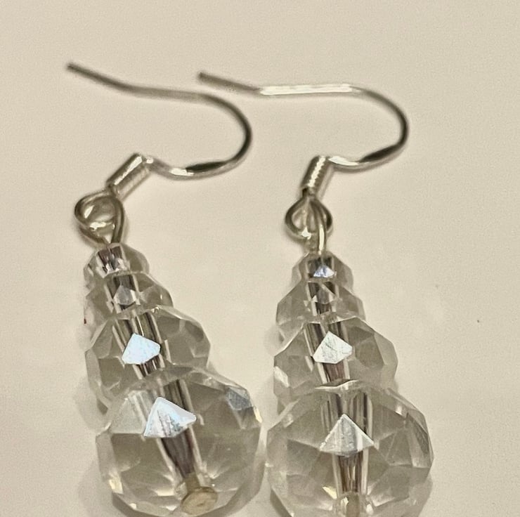 Simple and classic. These earrings are silver in tone, the ear wires are sterling silver, the drop wires are silver tone. Each earring is made up of 3 graduated glass crystal beads faceted with an aurora borealis finish. They are a small drop of 3cm. They are a fish hook style for pierced ears.
