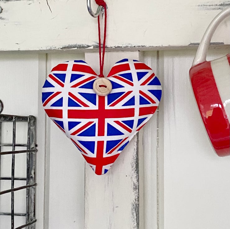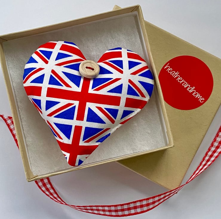This patriotic decorative heart, in smooth Union Flag printed cotton, is plumply padded with toy-grade stuffing or generously filled with locally grown Hampshire lavender and is hand finished with a round wooden button and red hemp twine hanging ties.