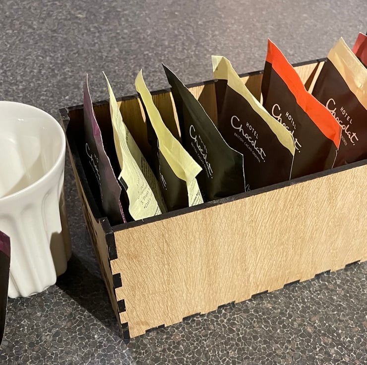 Store all those yummy sachets of velvetised happiness in this oak veneered display box. Easy access to your happy delights, but with a bit more style than the ripped cardboard box! Want to replace the hot chocolate sign? No worries - just get in touch with us!