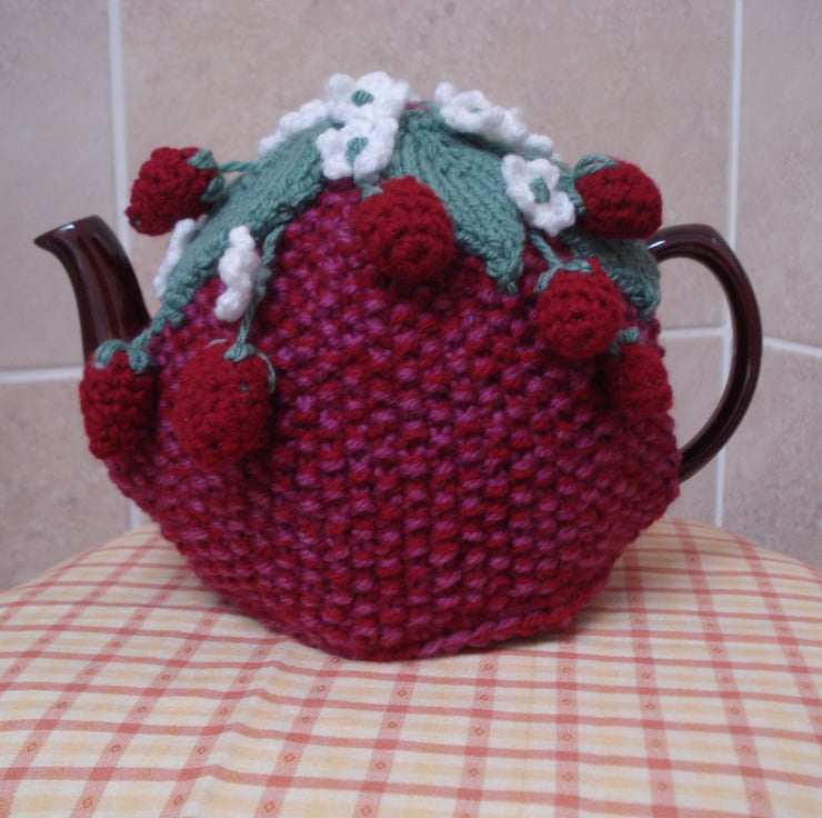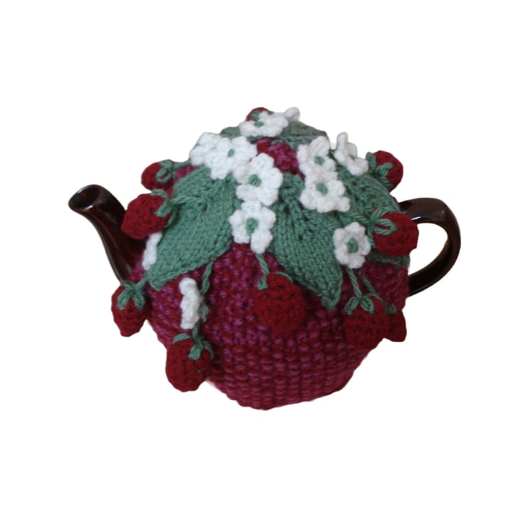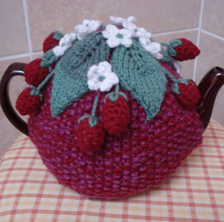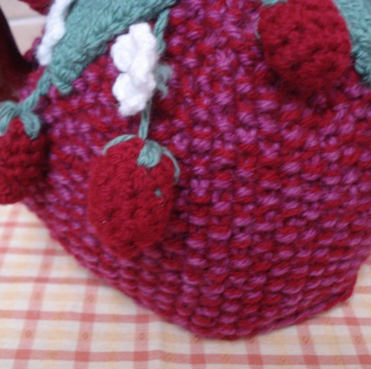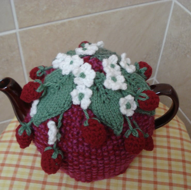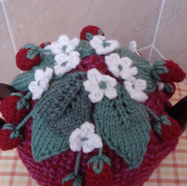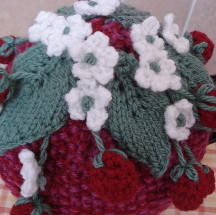 This is a hand knitted and crochet tea cosy. It has a red base with a top of leaves, flowers and strawberries. Would fit a 3-4 cup teapot. Ideal for that summer tea party and as a gift.